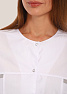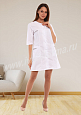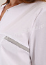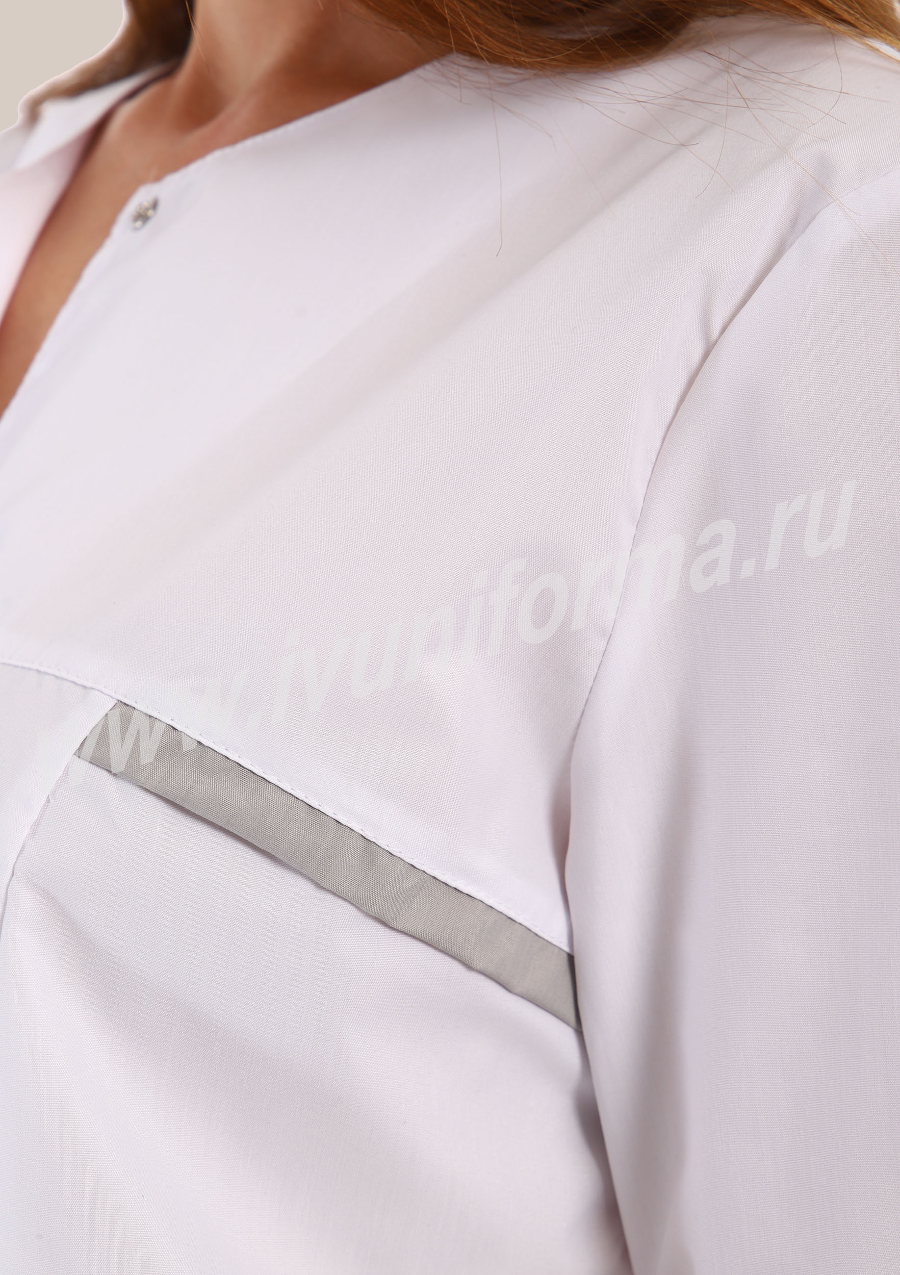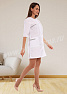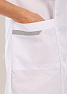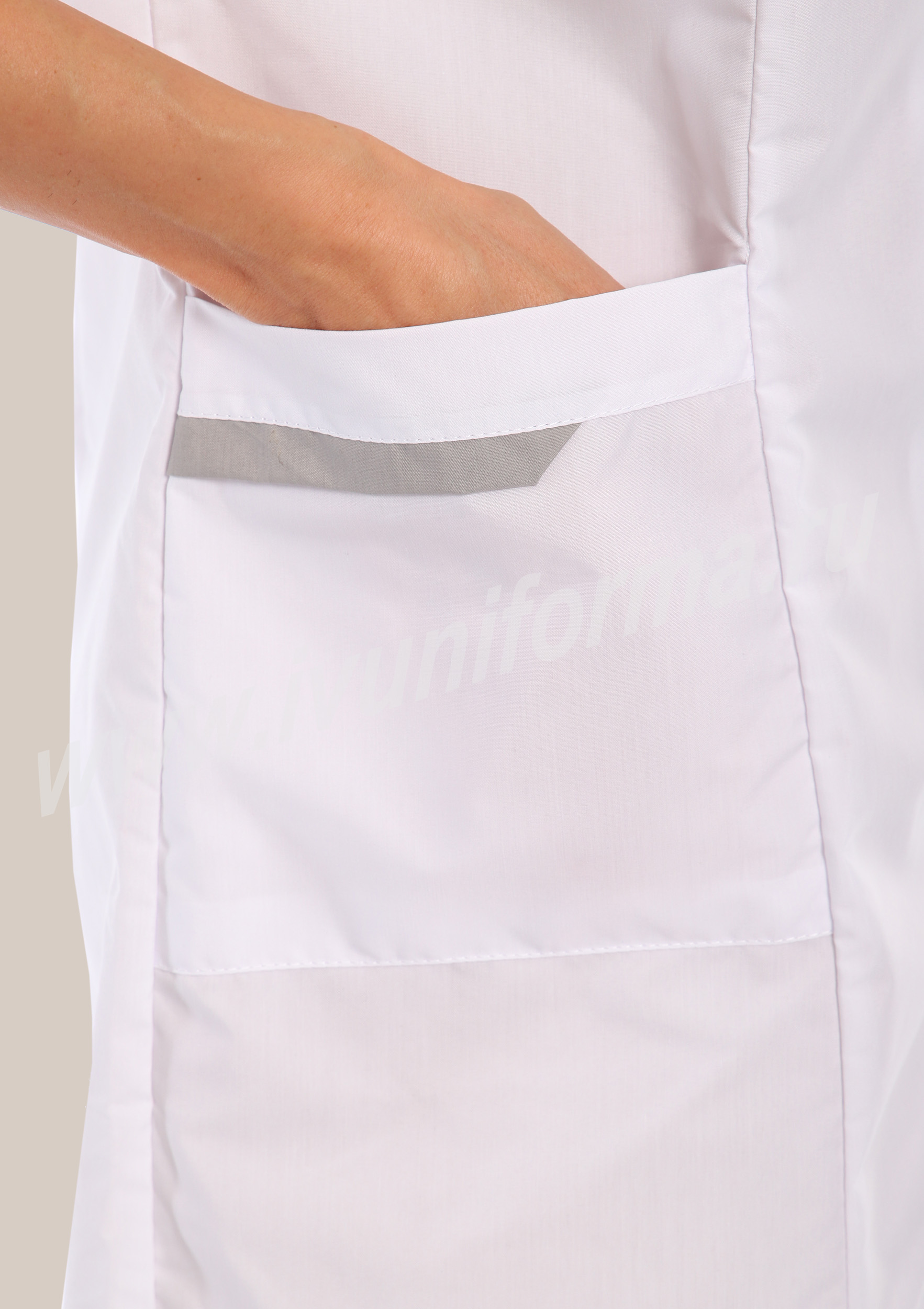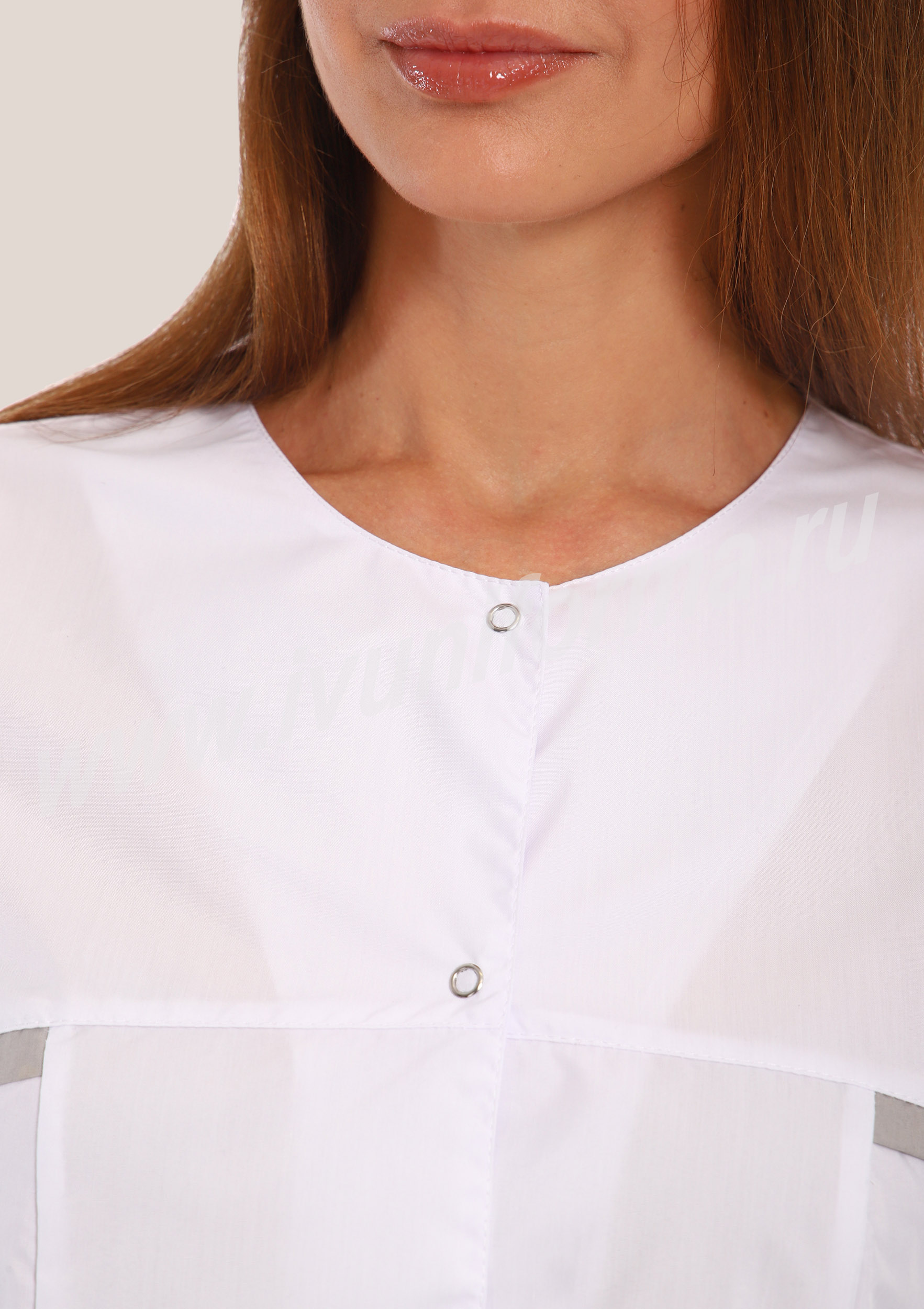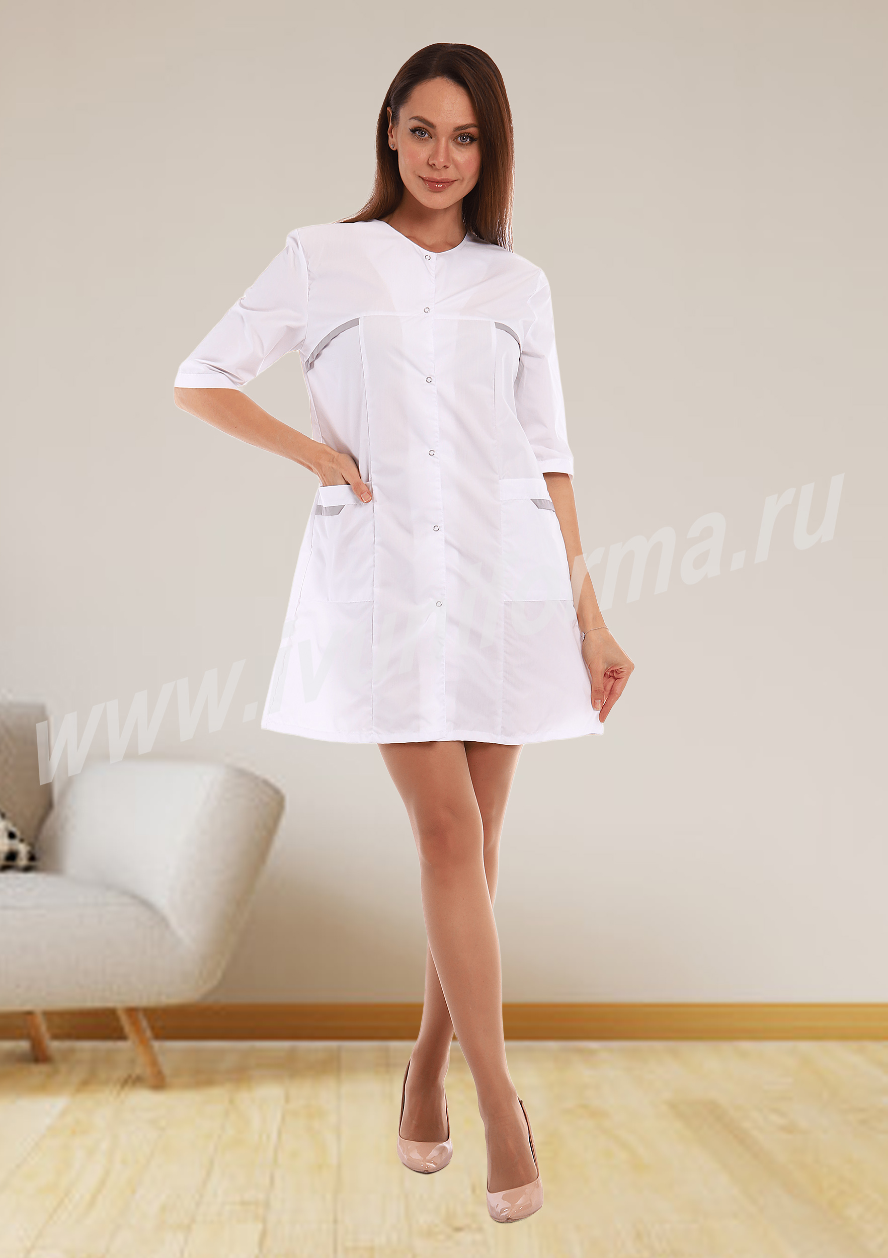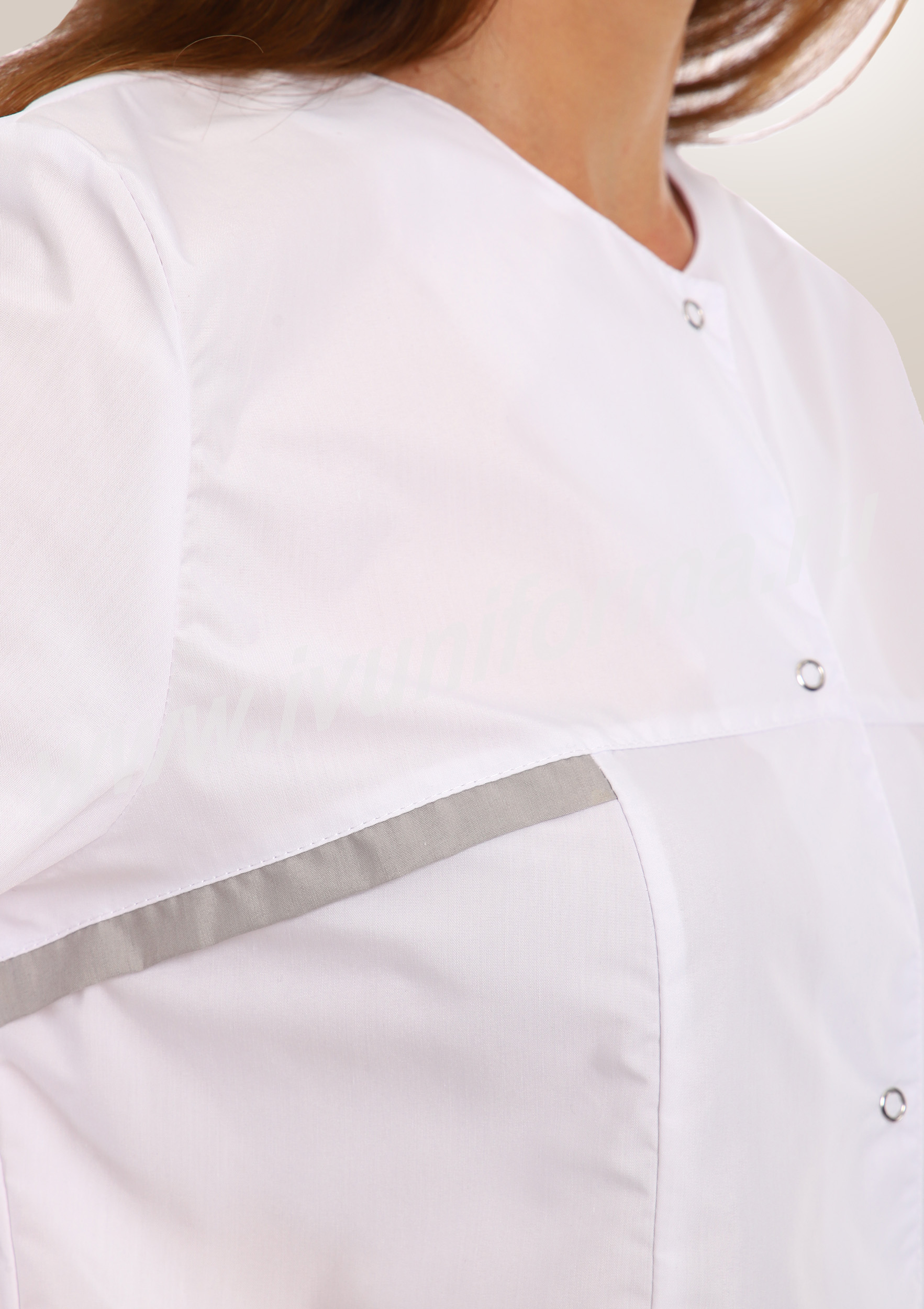 Халат женский укороченный, прилегающего силуэта с округлым вырезом горловины и центральной бортовой застежкой на кнопки. Комфортная посадка на фигуре обеспечивается за счет рельефных швов на полочке и спинке. Полочки с отрезными кокетками, двумя боковыми накладными карманами с отделкой из контрастного материала. Рукава втачные, длиной ¾. Спинка с декоративным хлястиком в центральной части делает эффектный акцент на талию. Халат прекрасно подойдет для тех, кто ценит практичность и комфорт, предназначен для медицинских работников и персонала СПА салонов.