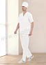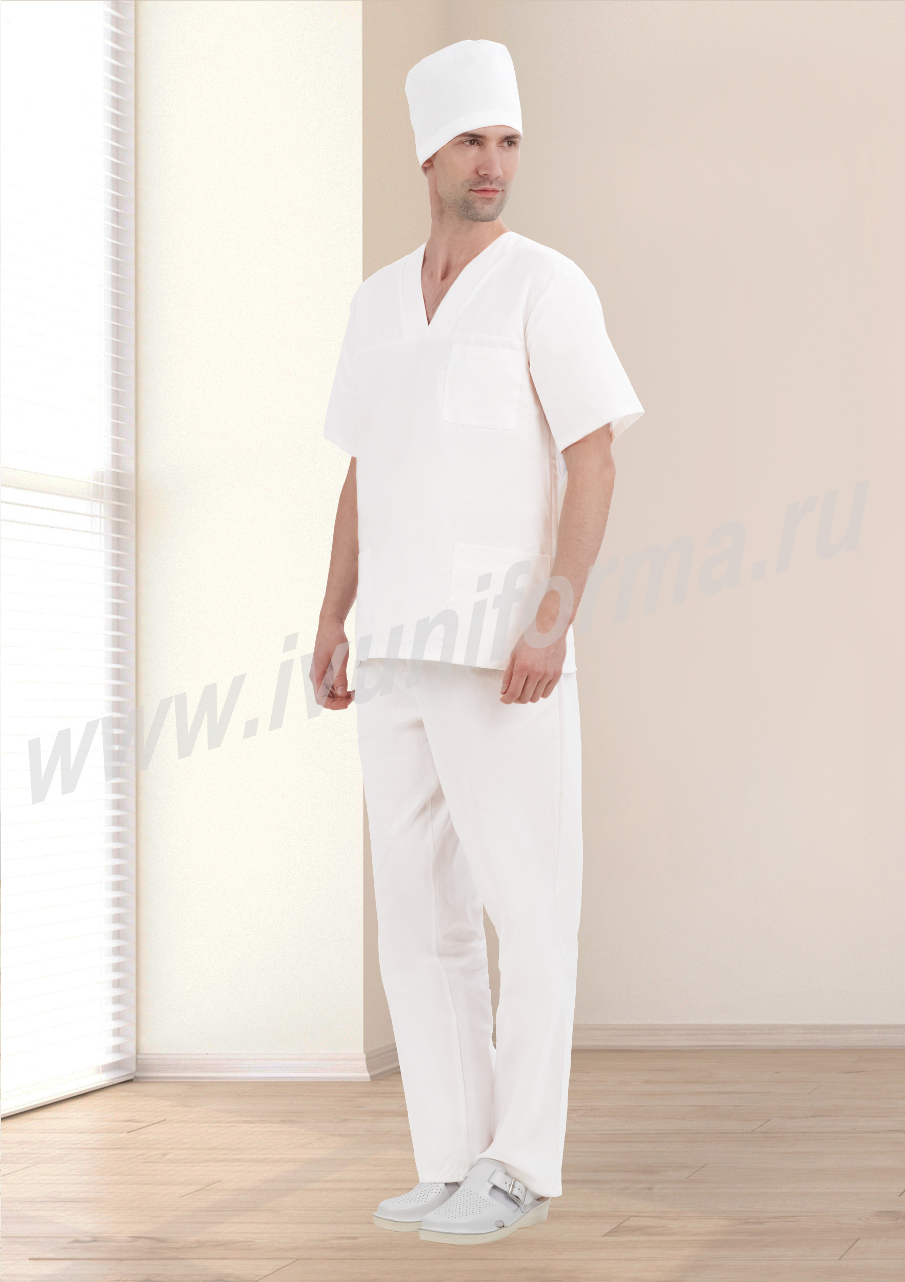 Костюм состоит из куртки и брюк. Куртка прямого силуэта с V-образным вырезом горловины, обработанной планками. На передней полочке расположены один нагрудный и два нижних накладных кармана. Горловина спинки обработана обтачкой. Рукав короткий, втачной. Брюки прямые, свободного облегания, с поясом на резинке. Для сборки костюма используются нитки в цвет ткани.