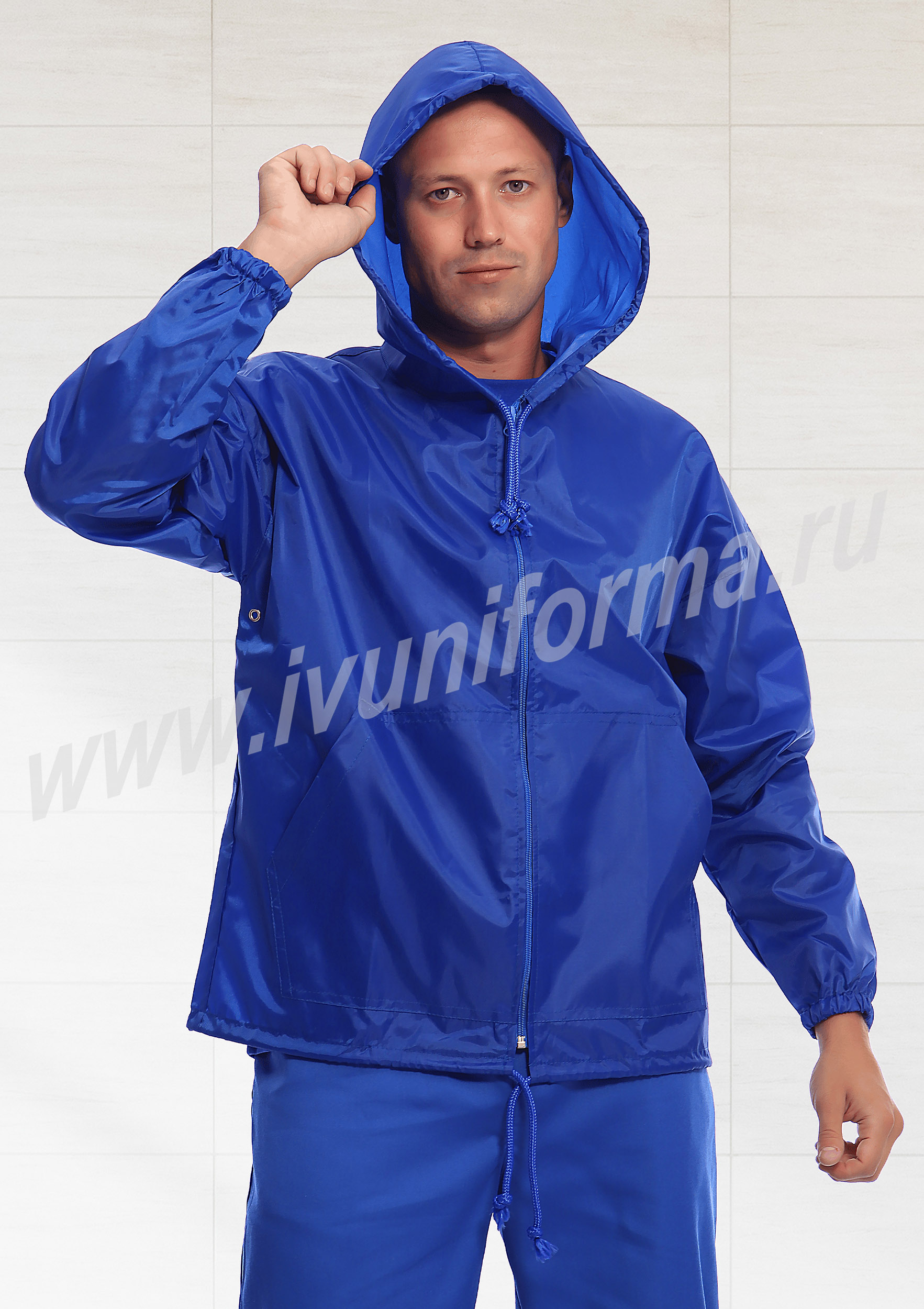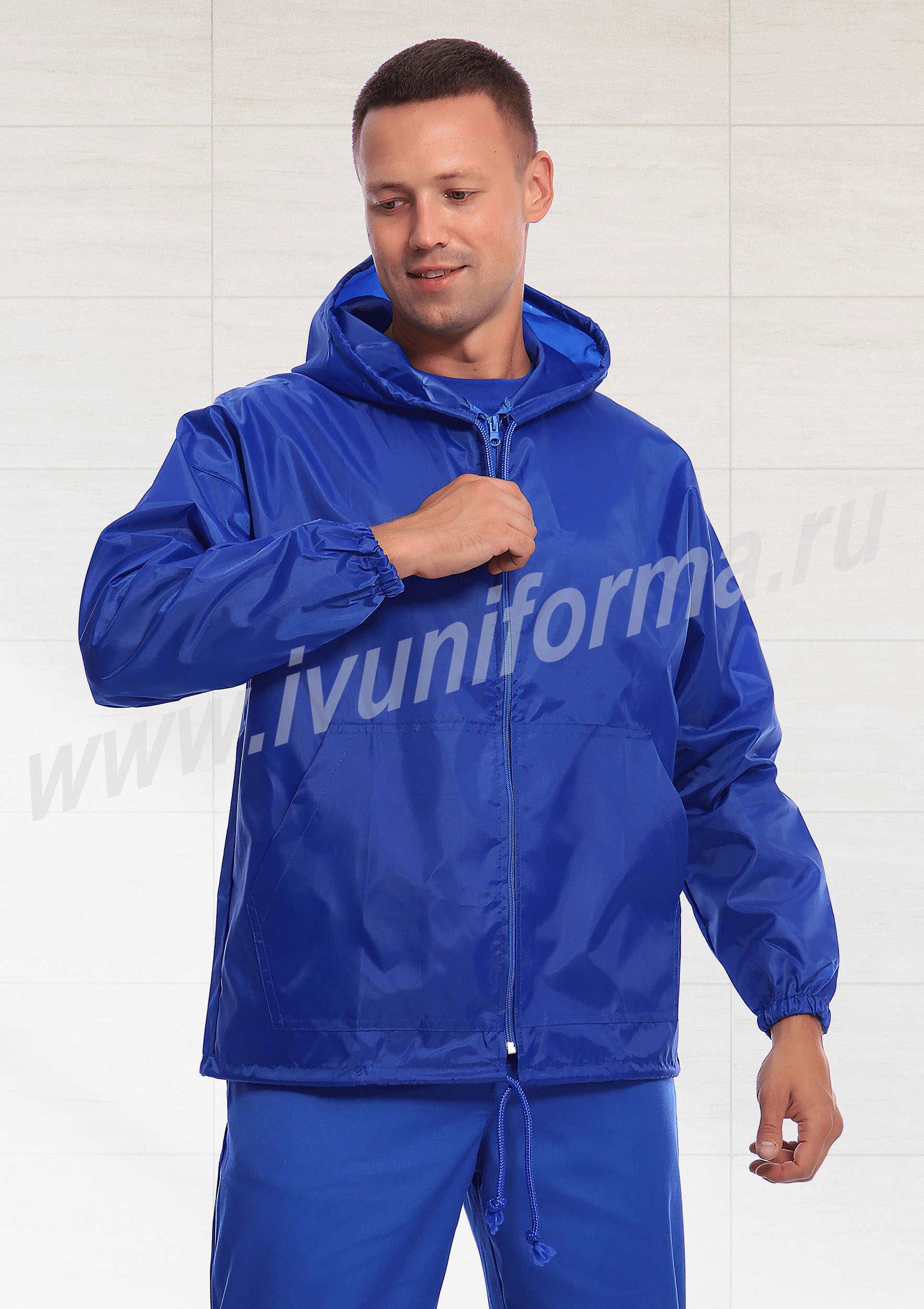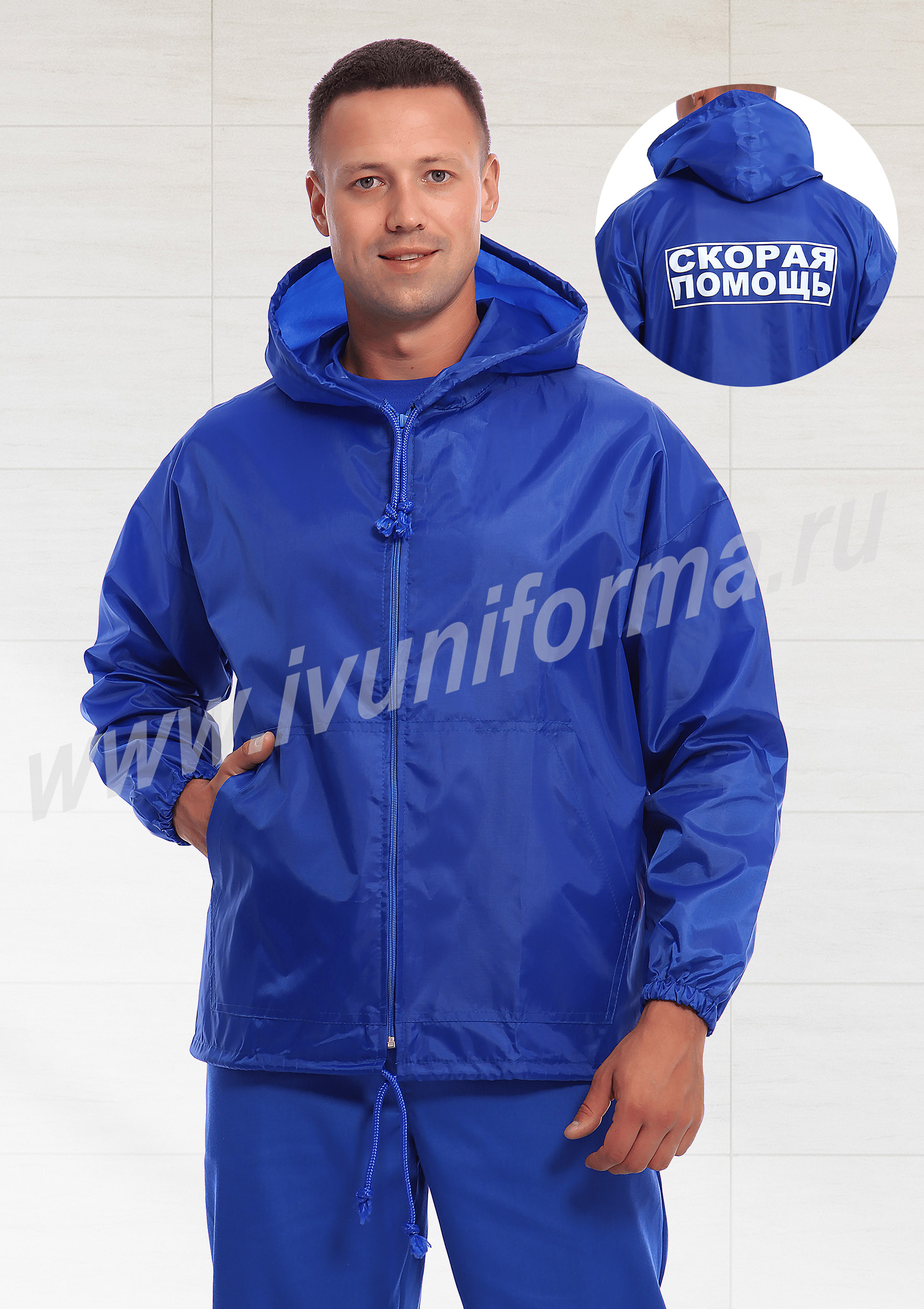 Ветровка мужская прямого силуэта с центральной застежкой на тесьму-молнию, с капюшоном. В нижней части полочки расположены два накладных кармана с наклонным входом. Спинка цельная с надписью «Скорая помощь». Рукав втачной, длинный, низ рукава с эластичной тесьмой. Люверсы под проймой обеспечивают дополнительную вентиляцию при носке изделия. Прилегание капюшона к голове и ветровки по низу регулируется шнурком. Ветровка выполнена из прочного износоустойчивого полиэстера с водоотталкивающей пропиткой.