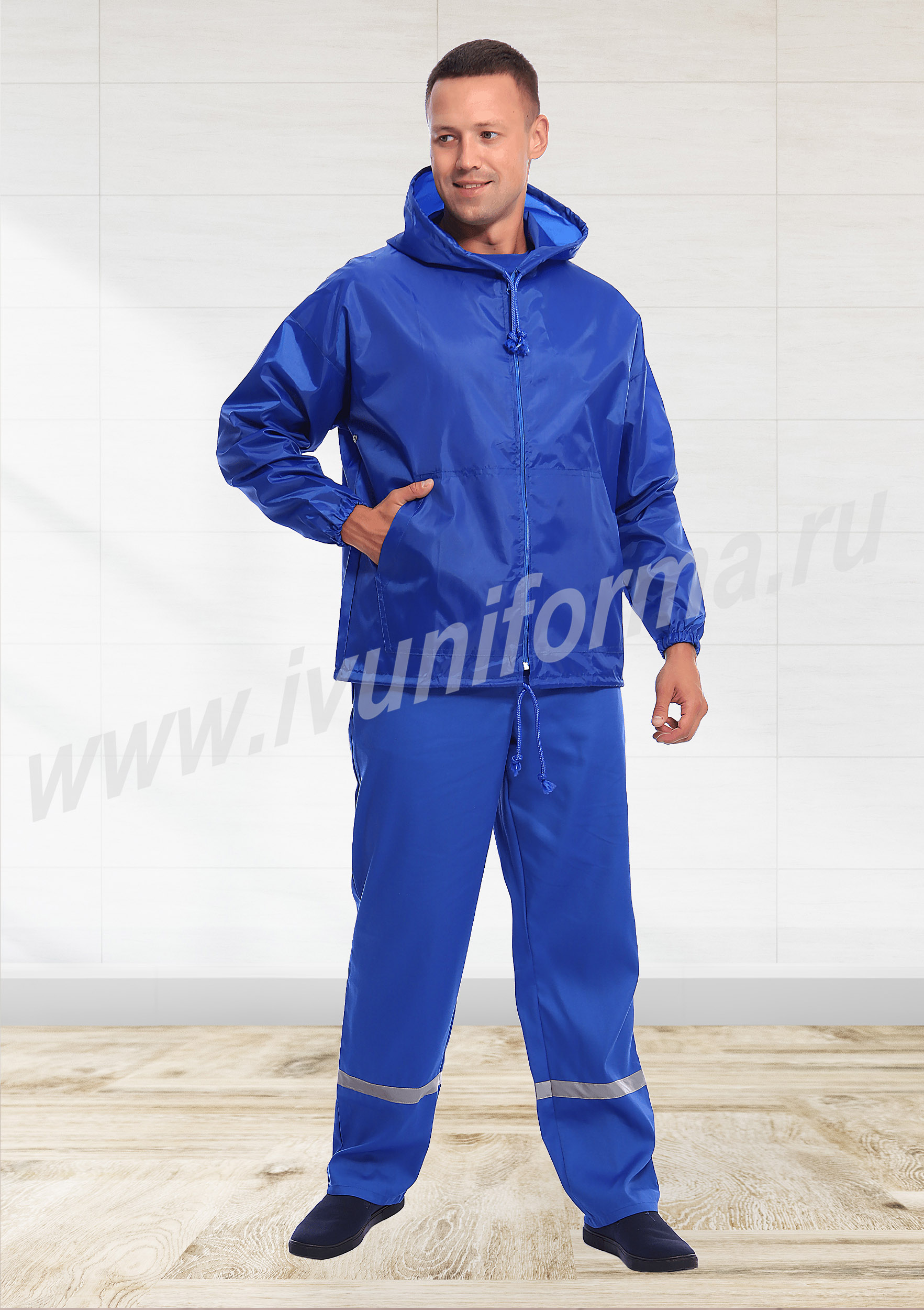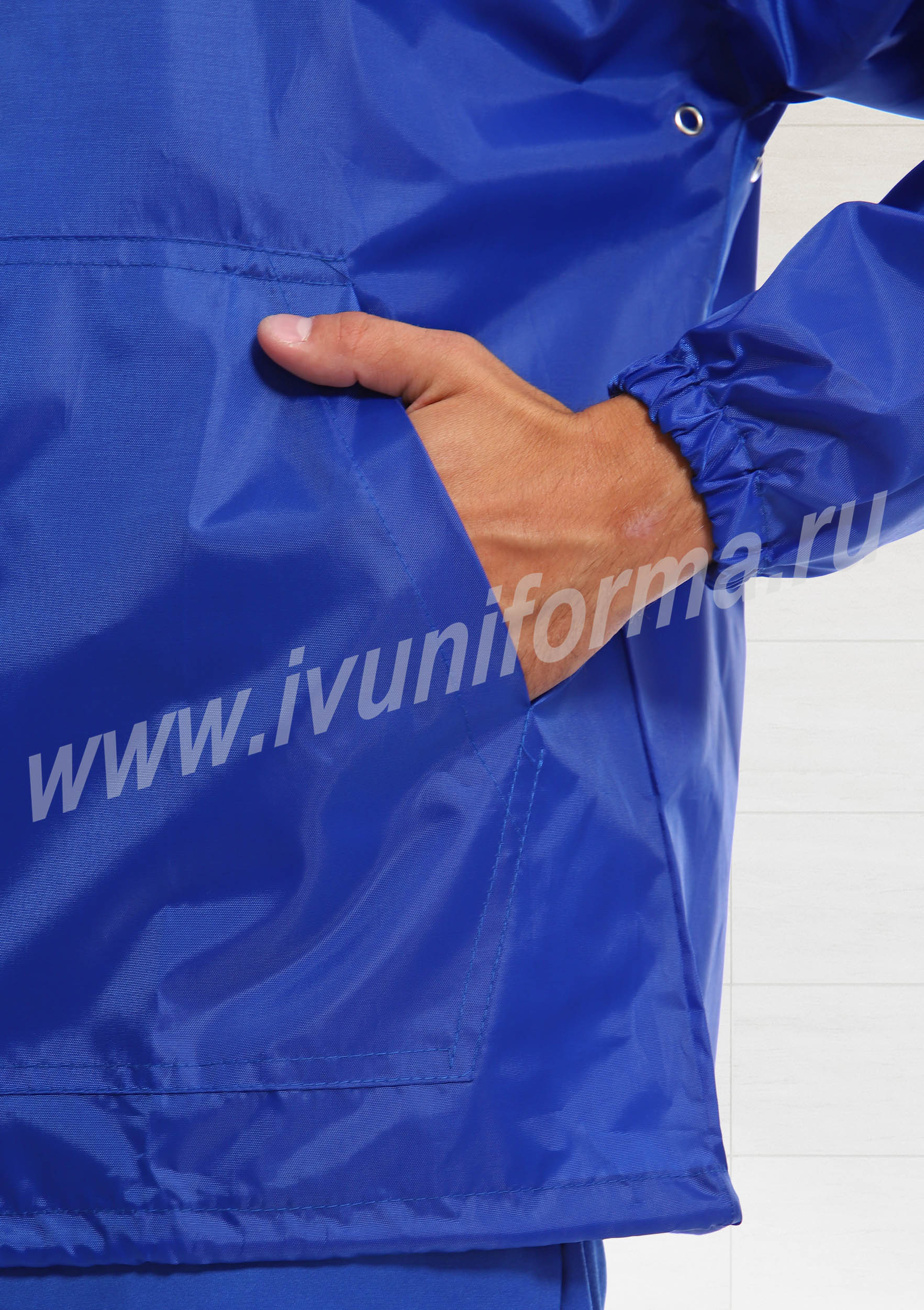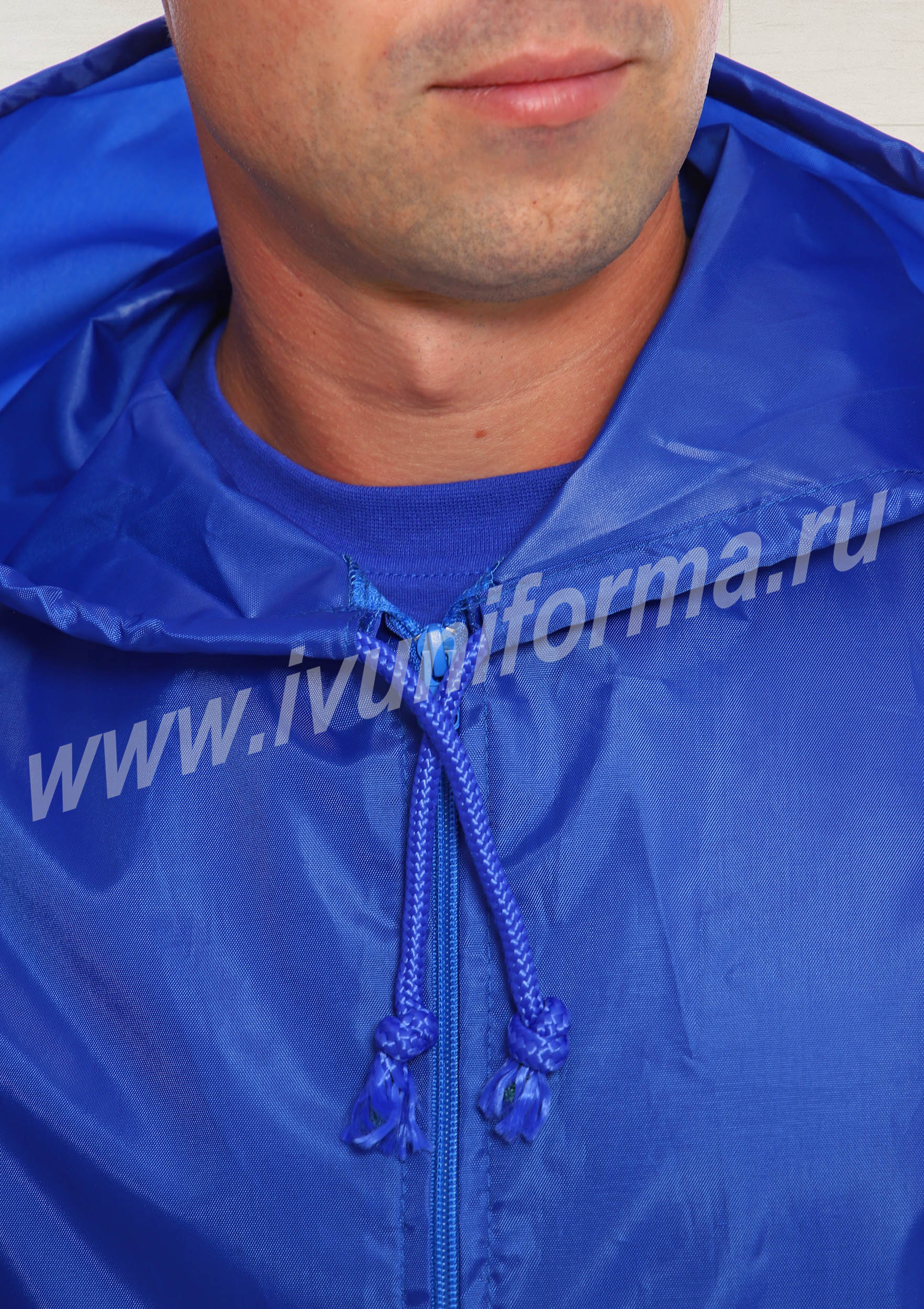 Ветровка мужская прямого силуэта с центральной застежкой на тесьму-молнию, с капюшоном. В нижней части полочки расположены два накладных кармана с наклонным входом. Спинка цельная с надписью «Скорая помощь». Рукав втачной, длинный, низ рукава с эластичной тесьмой. Люверсы под проймой обеспечивают дополнительную вентиляцию при носке изделия. Прилегание капюшона к голове и ветровки по низу регулируется шнурком. Ветровка выполнена из прочного износоустойчивого полиэстера с водоотталкивающей пропиткой.