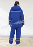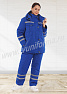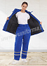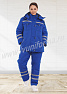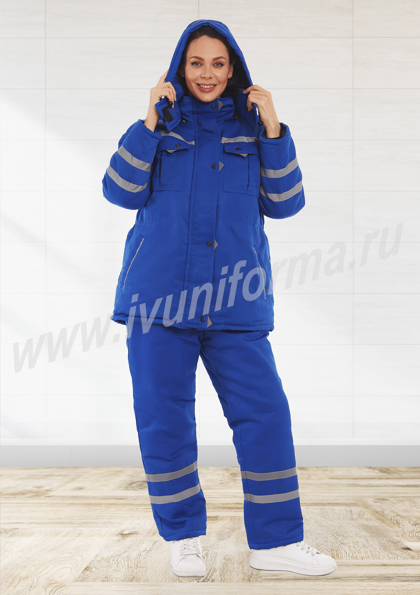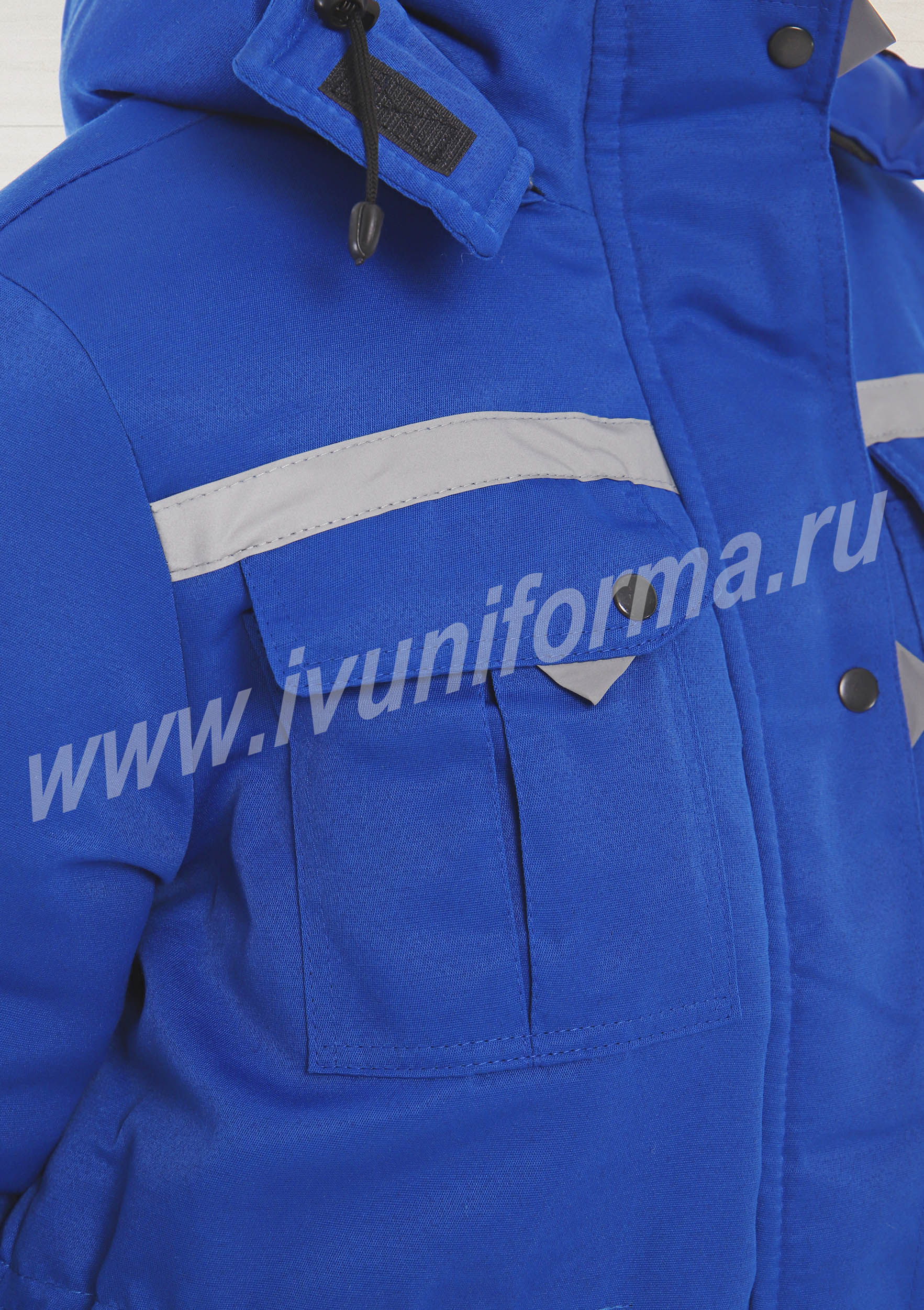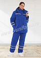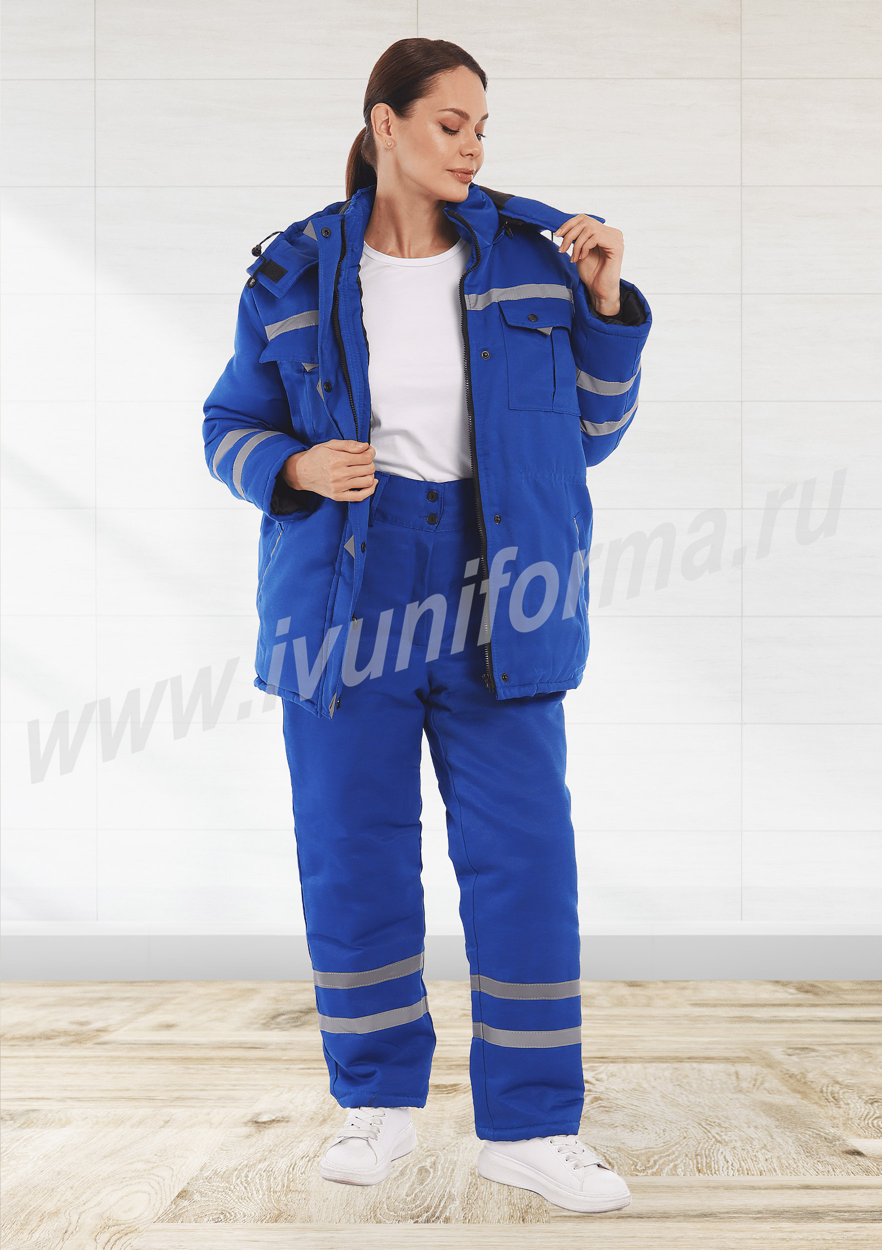 Костюм женский для скорой помощи состоит из куртки и брюк. Куртка средней длины с воротником стойкой, с центральной застежкой на молнию и ветрозащитной планкой на кнопки. Для регулировки объёма куртка имеет кулису на уровне талии. На куртке два фигурных нагрудных кармана с клапаном на кнопке и два нижних прорезных кармана. На передней части, спинке и рукавах светоотражающие ленты. Утепление куртки 450 гр/кв.м.