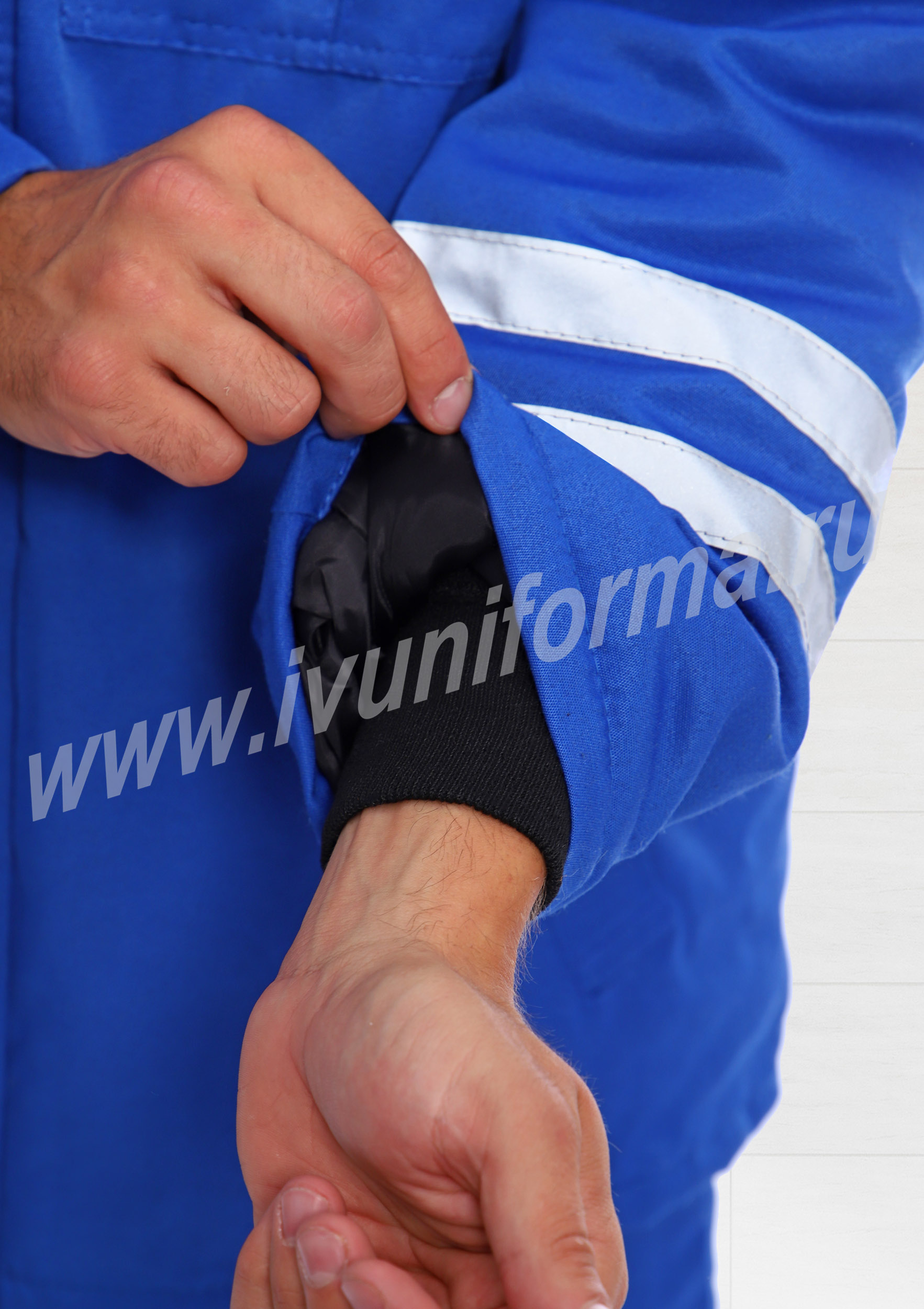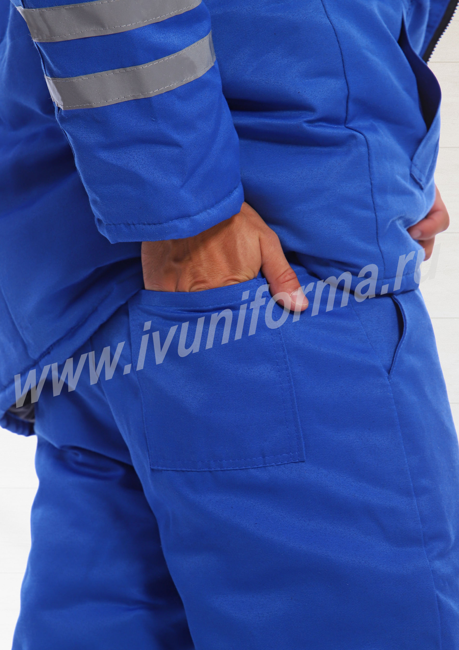 Костюм мужской для скорой помощи состоит из куртки и брюк. Куртка средней длины с воротником стойкой, с центральной застежкой на молнию и ветрозащитной планкой на кнопки. Для регулировки объёма куртка имеет кулису на уровне талии. На куртке два фигурных нагрудных кармана с клапаном на кнопке и два нижних прорезных кармана. На передней части, спинке и рукавах светоотражающие ленты. Утепление куртки 450 гр/кв.м.