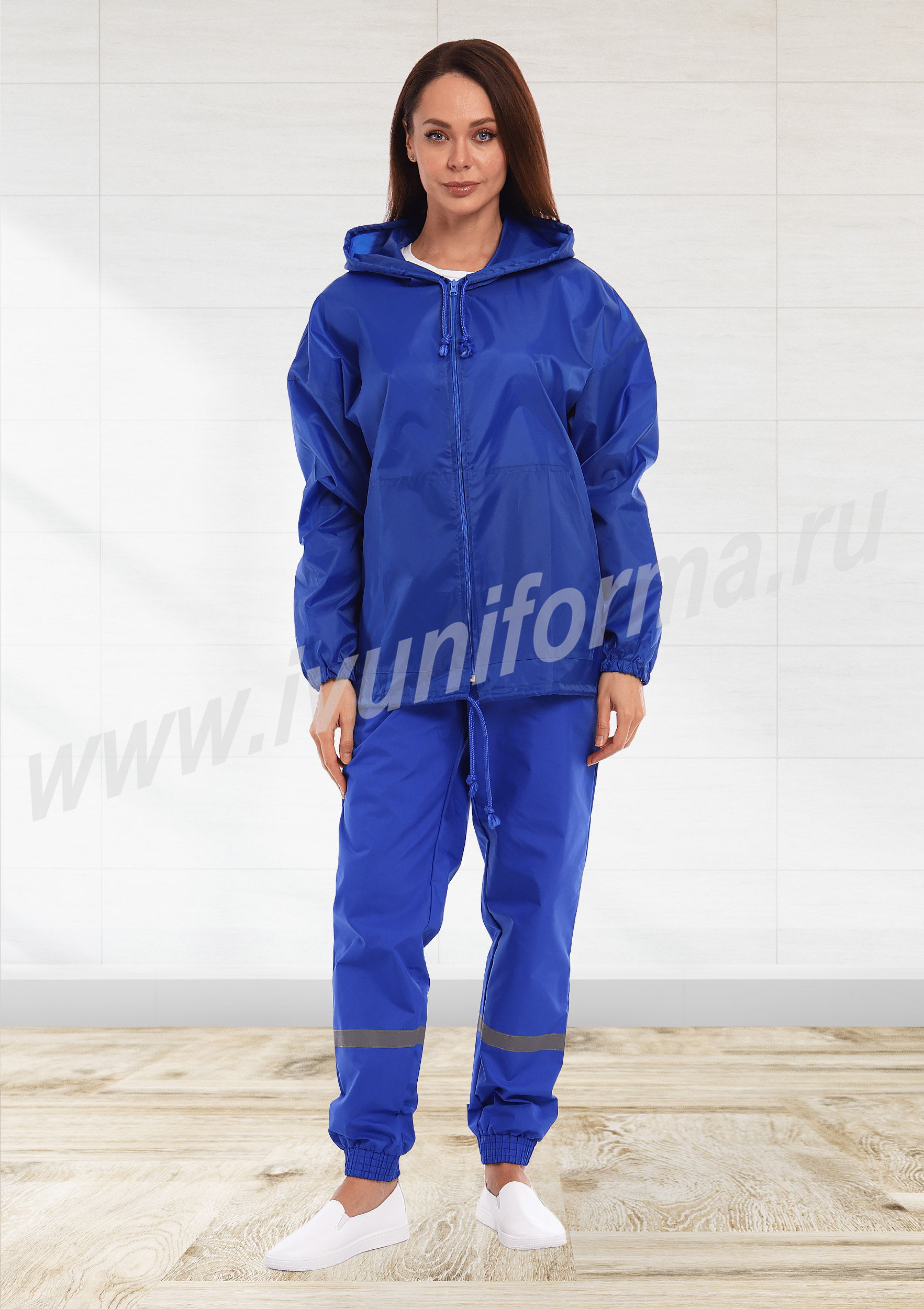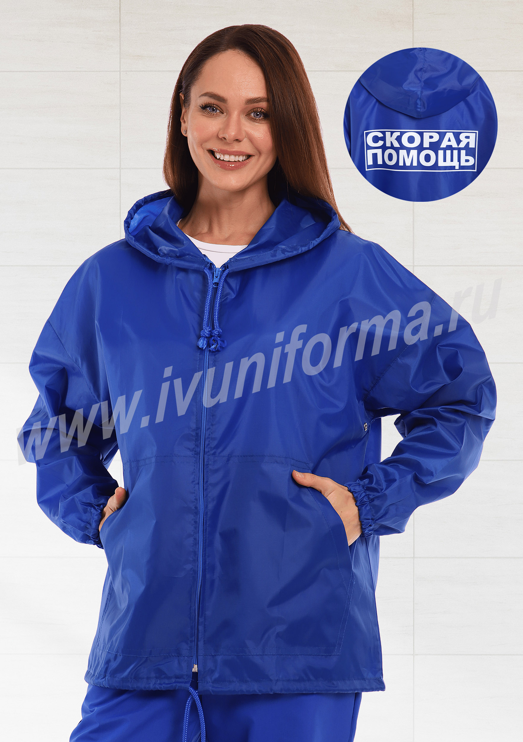 Ветровка женская прямого силуэта с центральной застежкой на тесьму-молнию, с капюшоном. В нижней части полочки расположены два накладных кармана с наклонным входом. Спинка цельная с надписью «Скорая помощь». Рукава втачные, одношовные, низ рукава с эластичной тесьмой. Люверсы под проймой обеспечивают дополнительную вентиляцию при носке изделия. Прилегание капюшона к голове и ветровки по низу регулируется шнурком. Ветровка выполнена из прочного износоустойчивого полиэстера с водоотталкивающей пропиткой.