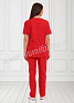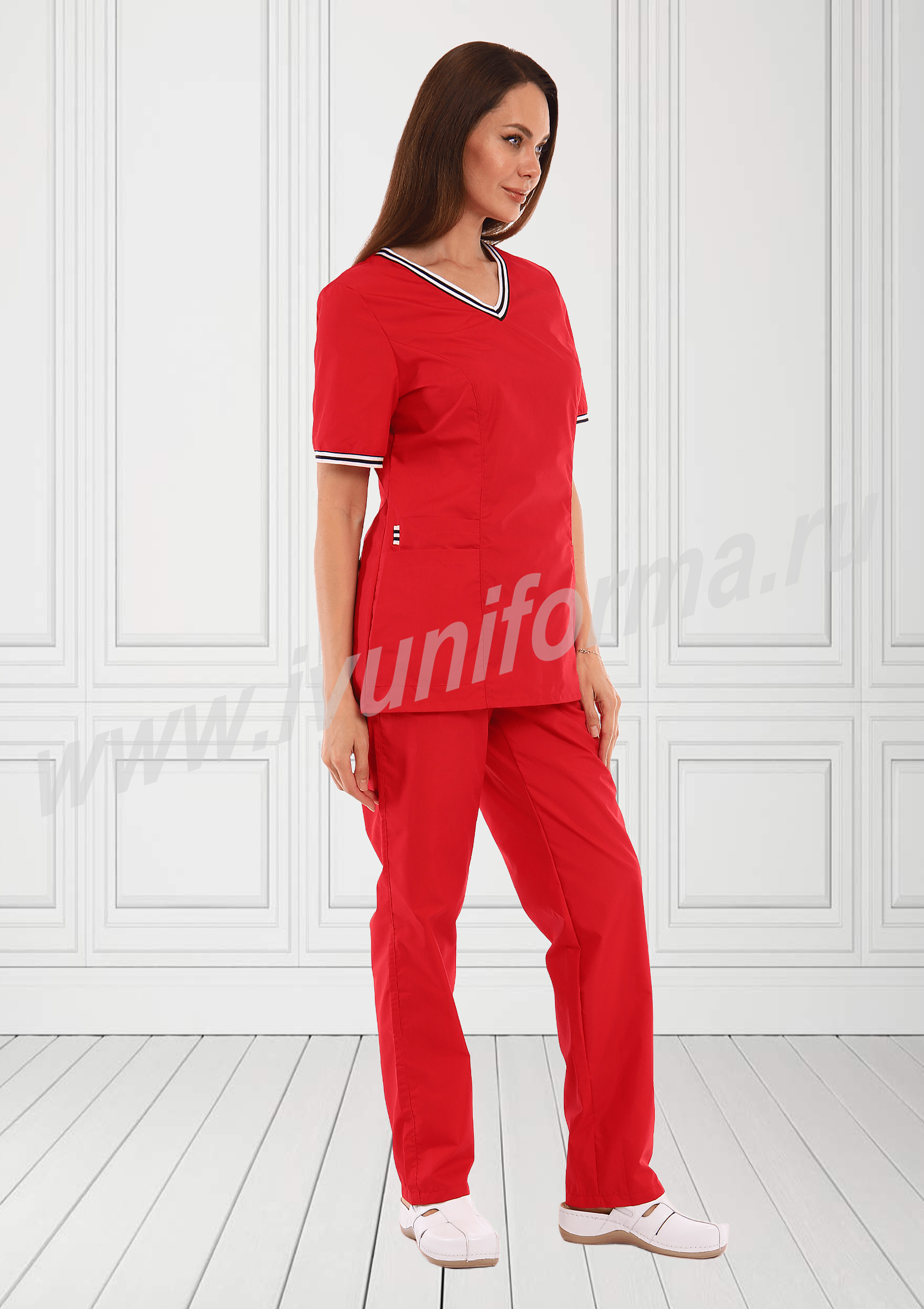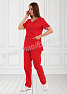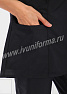 Медицинский костюм, выполненный в современном спортивном стиле, состоит из куртки и брюк. Куртка прилегающего силуэта, средней длины, с V-образным вырезом горловины, короткими рукавами. Полочка и спинка с рельефами, выходящими из проймы. В нижней части полочки присутствуют два вместительных накладных кармана, с правой стороны предусмотрен дополнительный карман для мелочей. Контрастная отделка из мягкой трикотажной ленты по горловине и низу рукавов делает костюм ярким и эффектным. Брюки прямые на эластичном поясе имеют два кармана с косой линией входа. Костюм выполнен из легкой смесовой ткани, прост в уходе, предназначен для медицинских работников и персонала СПА салонов.