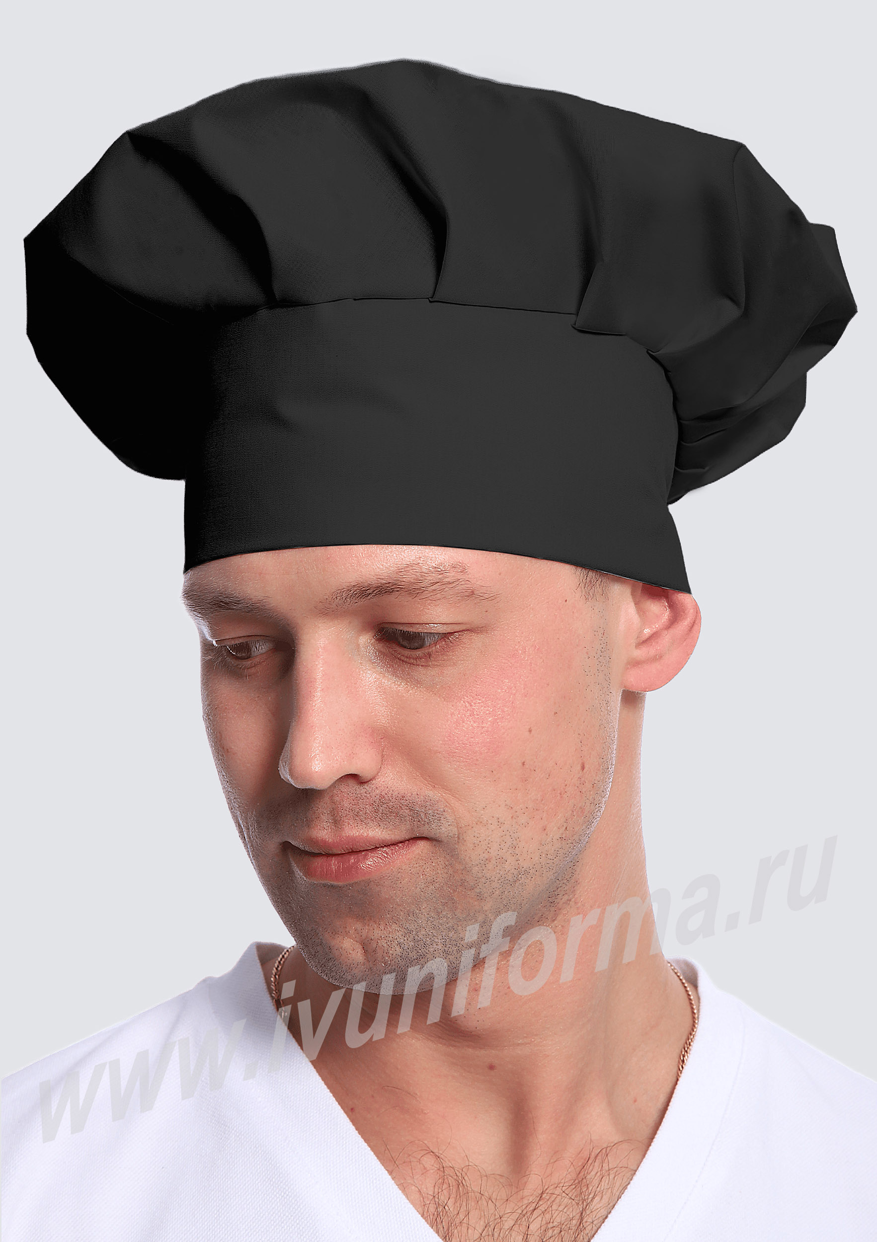 Колпак повара, имеющий форму гриба, черный мужской с объемной тульей, заложенной в равномерные складки. Размер колпака регулируется за счет вставки с эластичной тесьмой, что делает его удобным и практичным. Колпак повара предназначен для сотрудников пищевой отрасли.