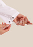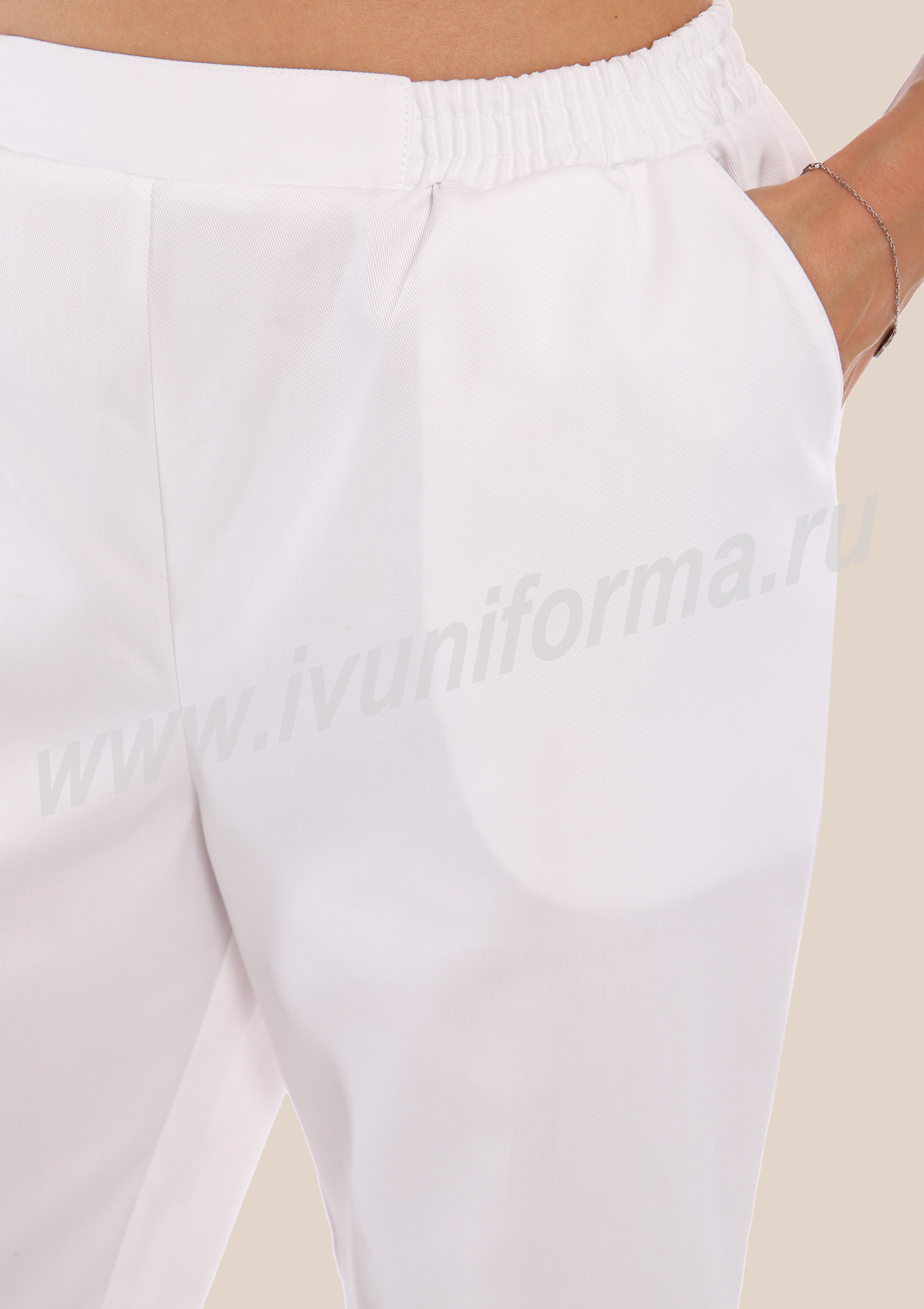 Костюм женский состоит из куртки и брюк. Куртка удлиненная прямого силуэта с центральной потайной застежкой на две кнопки. Полочка с нагрудными вытачками, с отрезными кокетками. Спинка прямая. Рукав втачной длинный, прилегание рукава по низу регулируется кнопками. Воротник стойка с потайной застежкой на кнопку обеспечивает изоляцию кожных покровов в области шеи. В боковых швах куртки предусмотрены разрезы для легкого доступа в карманы брюк. Брюки прямые на эластичном поясе со вставкой для комфортной посадки на талии и верхними боковыми карманами с наклонным входом. Костюм выполнен из смесовой износоустойчивой ткани, с повышенным содержанием хлопка, что полностью соответветствует требованиям к одежде для пищевой промышленности, лаборантов и фармацевтов. Костюм предназначен для защиты от общих производственных загрязнений. Модель разработана в соответствии с международными требованиями безопасности пищевого производства согласно системе НАССР (ХАССП).