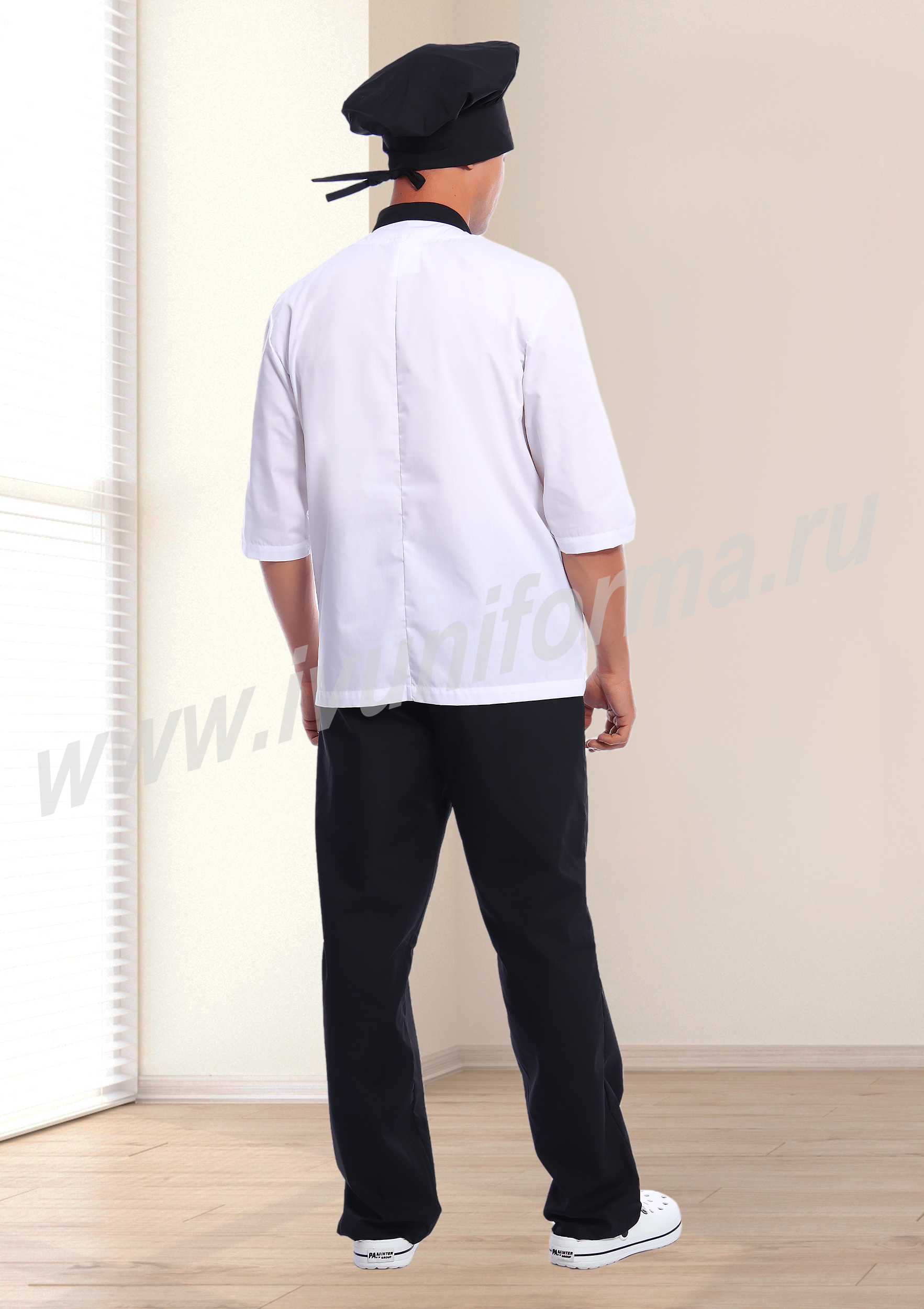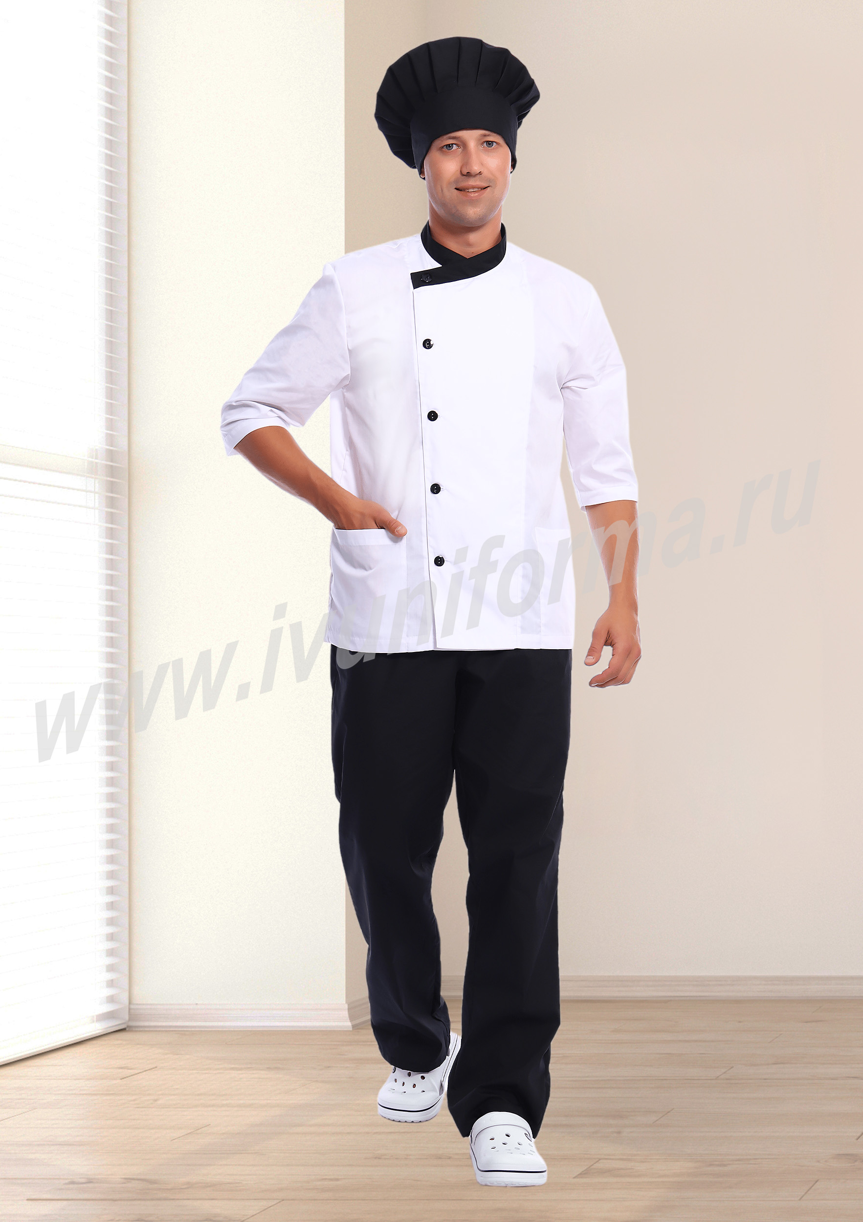 Современный мужской костюм состоит из куртки (кителя) и брюк. Куртка прямого силуэта средней длины со смещенной бортовой застежкой на петли и пуговицы. Полочка с вертикальными рельефами, выходящими из плечевых швов и вместительными накладными карманами в нижней части. Спинка со средним швом. Рукав втачной, длиной 3/4. Воротник стойка, выполненный из отделочного материала, удобен и функционален. Брюки прямые на эластичном поясе со вставкой для комфортной посадки на талии выполнены из отделочного материала. Костюм изготовлен из устойчивой к загрязнениям ткани, не сковывает движения и обеспечивает комфорт во время рабочего процесса, предназначен для работников пищевой промышленности.
