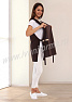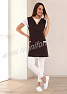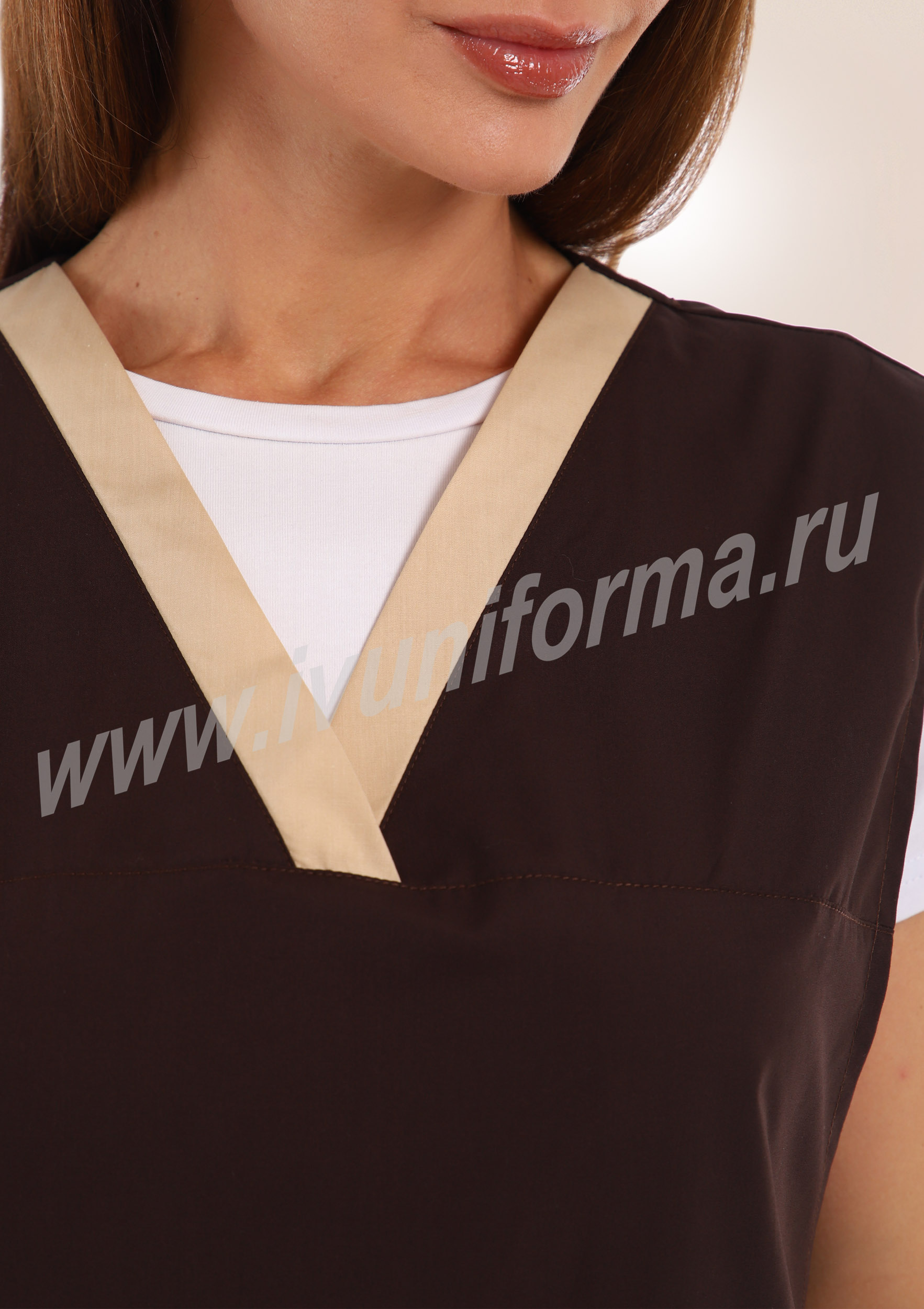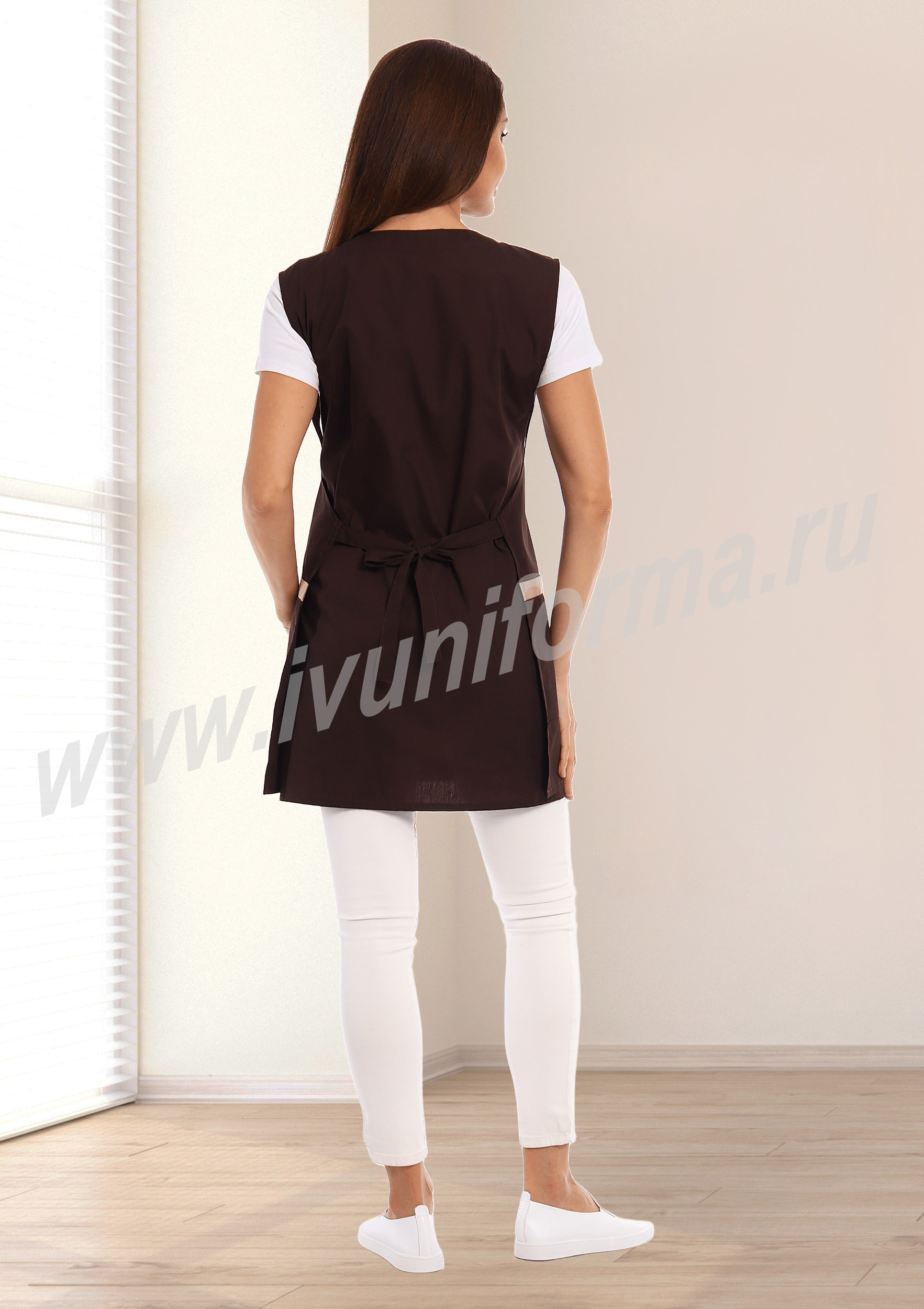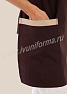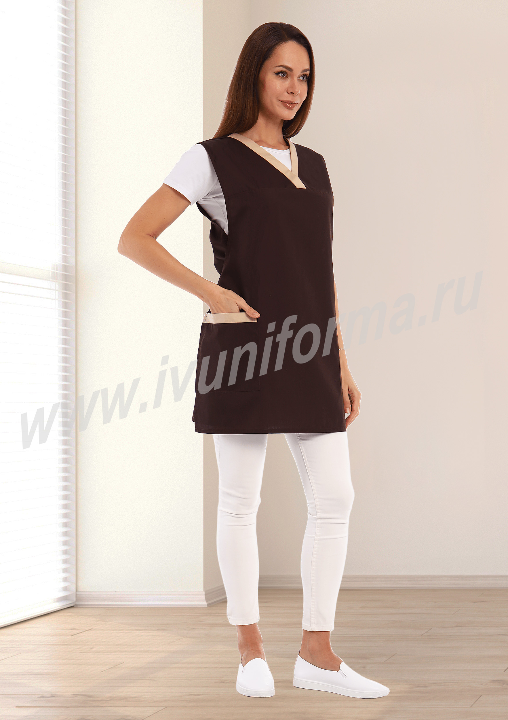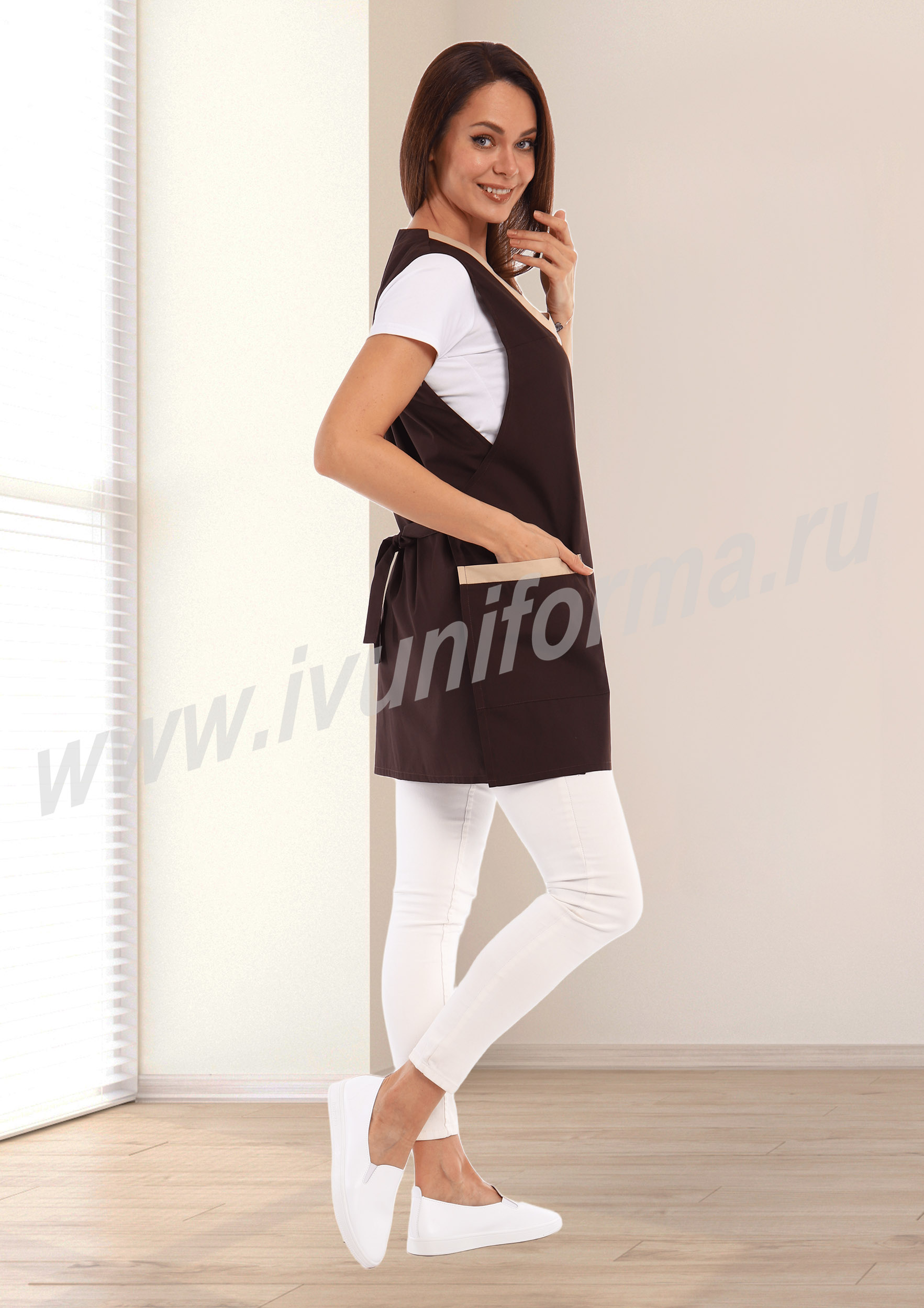 Фартук средней длины, перекидной. Спинка без отделки. Полочка с отрезной кокеткой, декорированной отделочными планками, выполненными из ткани контрастного цвета. В нижней части фартука имеются два накладных вместительных кармана с отделочными планками. Объем фартука регулируется завязками – поясами. Изделие изготовлено из легкой и прочной ткани, с водоотталкивающей пропиткой, что придает фартуку универсальность при использовании его для защиты от общепроизводственных загрязнений.