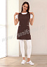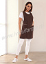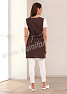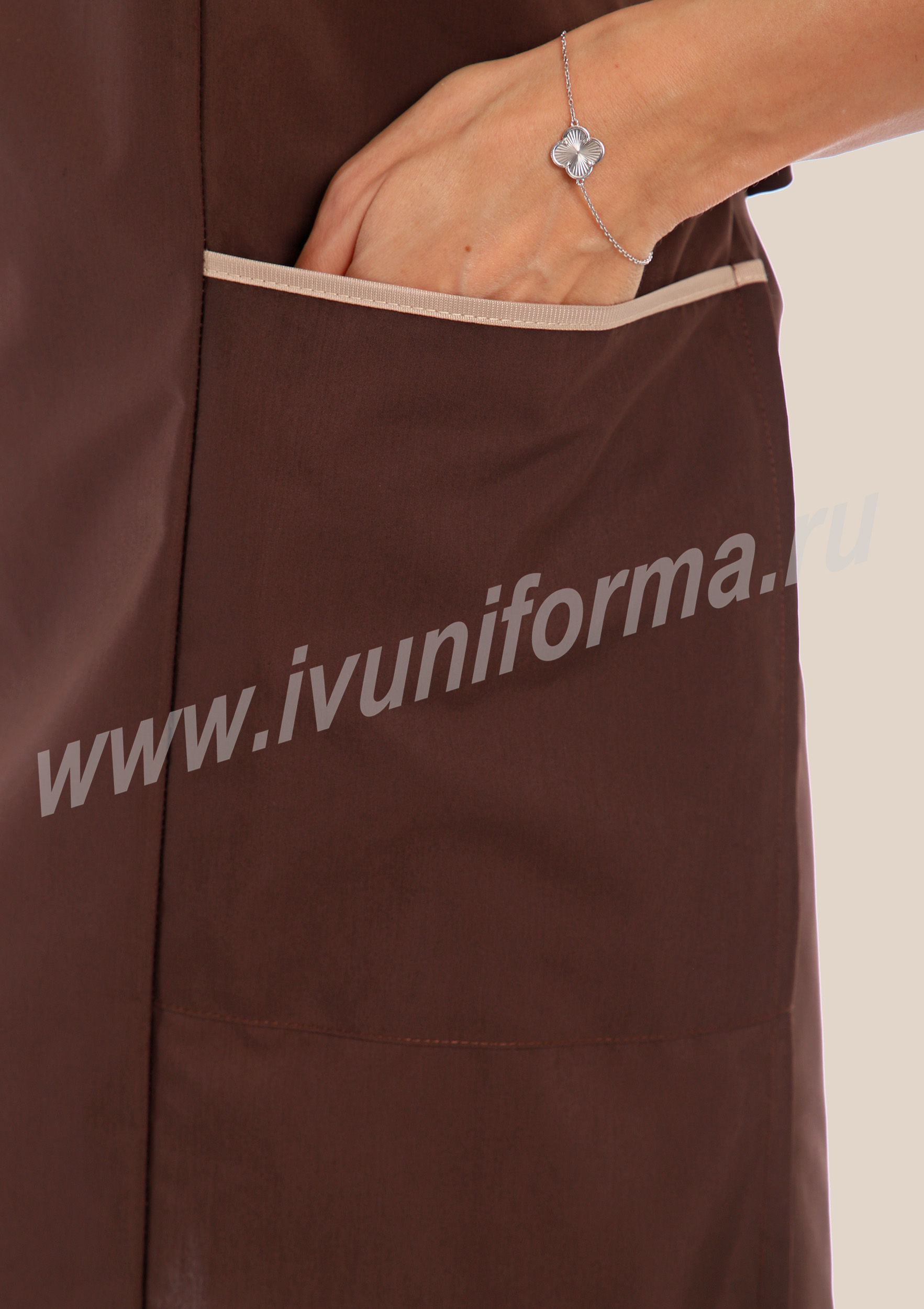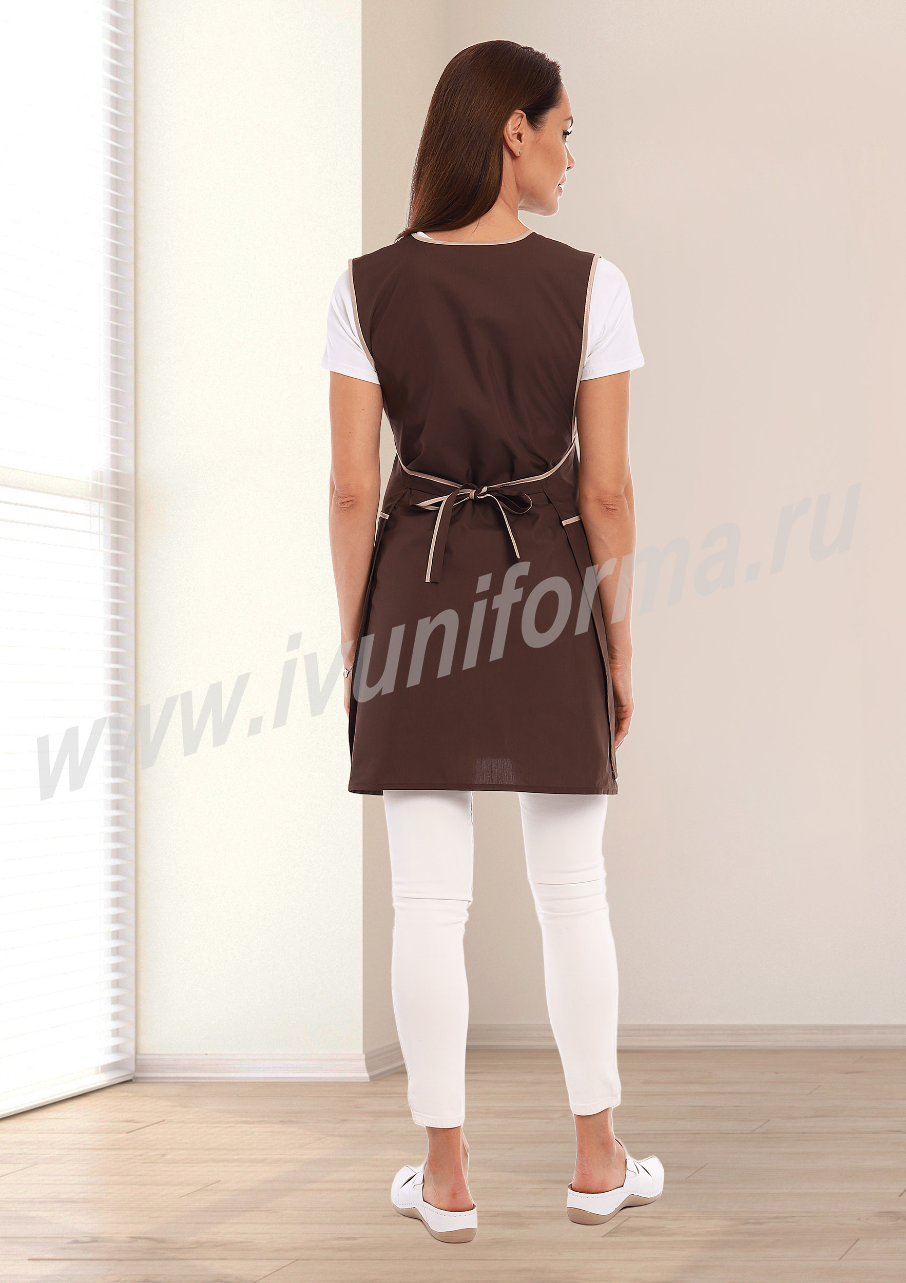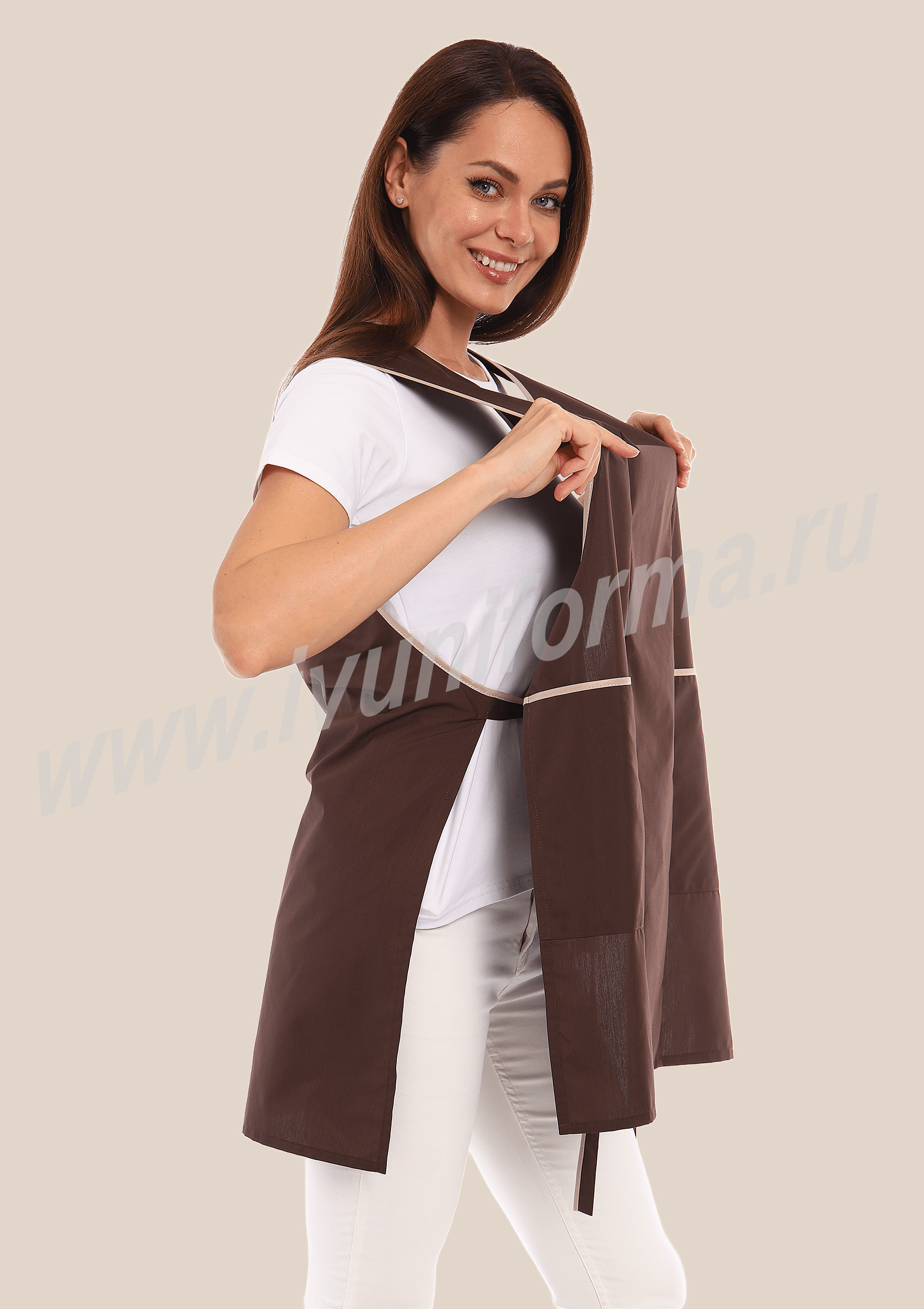 Фартук средней длины, перекидной. Спинка без отделки. Полочка с округлым вырезом горловины и рельефами, выходящими из плечевых швов, с двумя накладными вместительными карманами в нижней части фартука. Объем фартука по линии талии регулируется завязками – поясами. Изделие изготовлено из легкой и прочной смесовой ткани, с водоотталкивающей пропиткой, что придает фартуку универсальность при использовании его для защиты от общепроизводственных загрязнений в разных сферах деятельности.