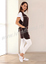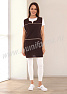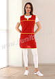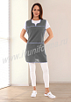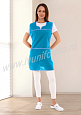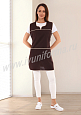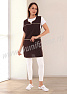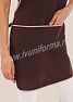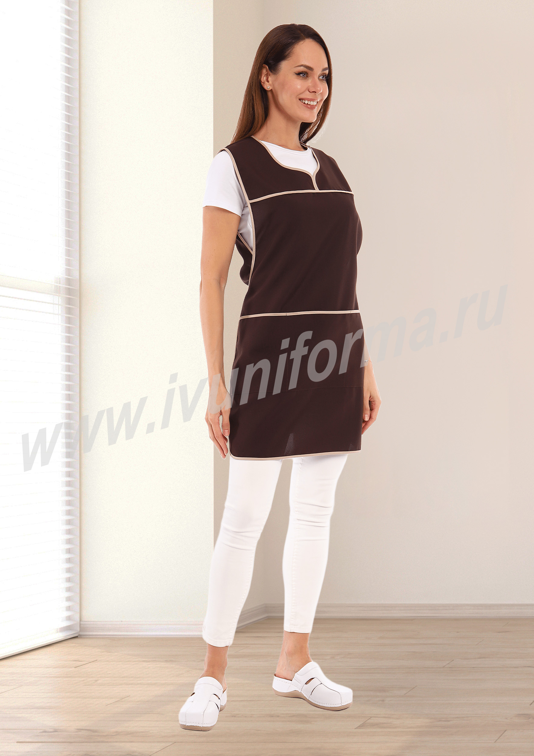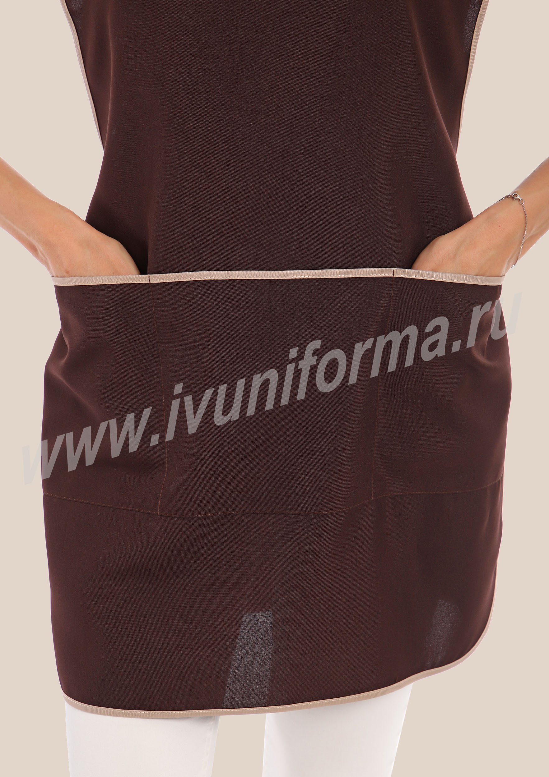 Фартук средней длины, перекидной, имеющий спинку без отделки и полочку с отрезными симметричными кокетками. В нижней части полочки расположены вместительные карманы. Объем талии фартука регулируется завязками – поясами. Все срезы фартука обработаны кантом из контрастной капроновой ткани. Фартук предназначен для защиты от общепроизводственных загрязнений.