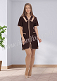 Халат женский укороченный прямого силуэта с центральной застежкой на молнию. Полочка с двумя нижними накладными карманами и разрезами по боковым швам, спинка без отделки. Рукав короткий, втачной. Нижний слой отложного полуворотника выполнен из контрастной ткани. Объем талии регулируется двумя полупоясами. Все срезы халата обработаны капроновым кантом. Для увеличения прочности халата выполнено дополнительное усиление швов центральной застежки и карманов. Халат предназначен для защиты от общепроизводственных загрязнений.