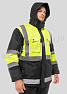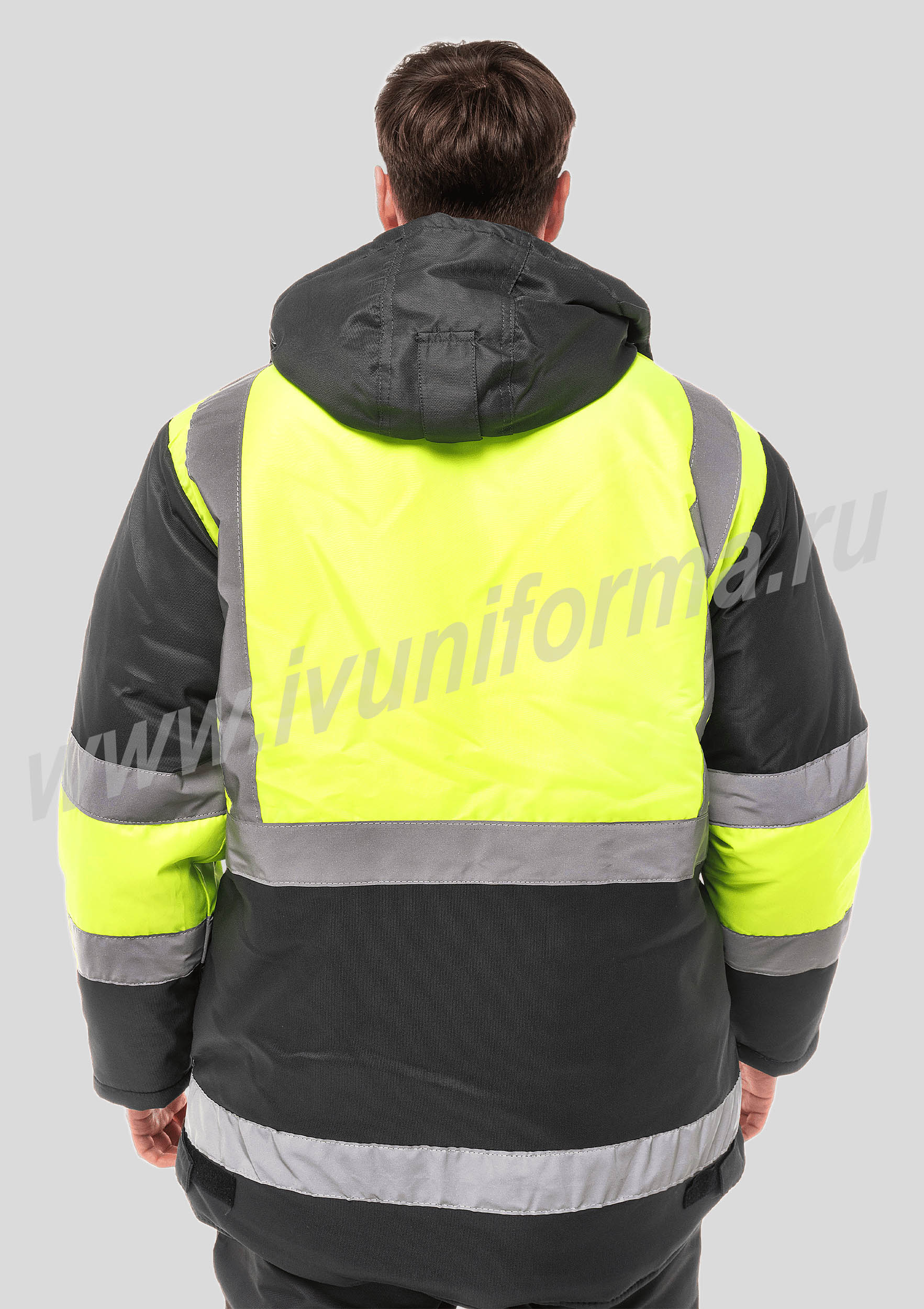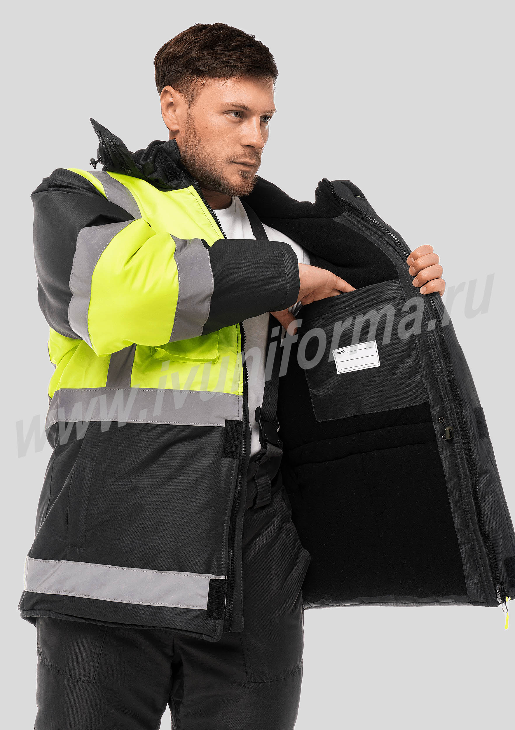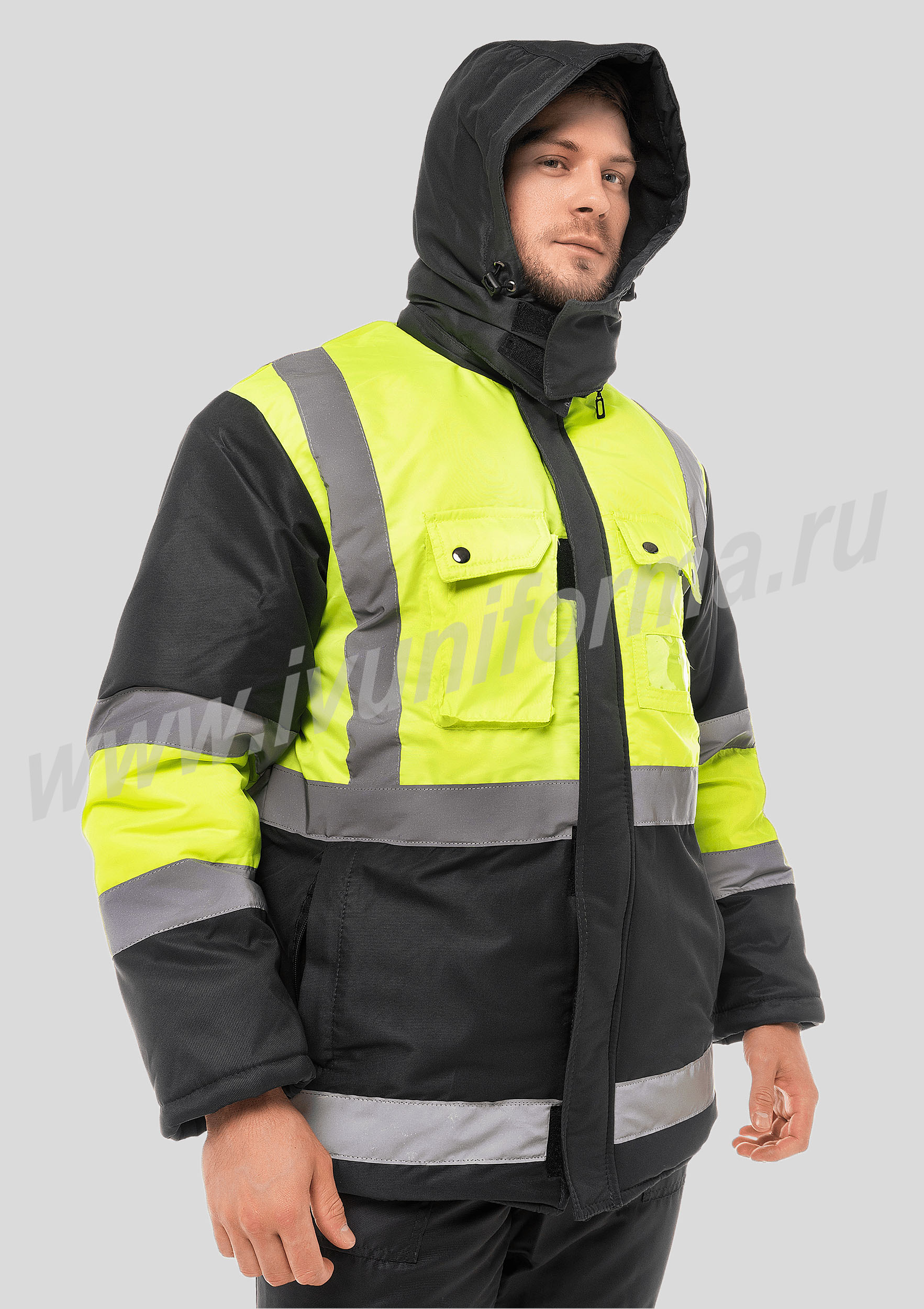 Куртка рабочая мужская имеет удлиненный прямой силуэт и ветрозащитную планку с застёжкой на контактную ленту. Изделие оснащено нагрудным карманом с окном для бейджа и объемным карманом под рацию. Прилегание куртки по талии регулируется по низу куртки. Съемный капюшон с возможностью регулировки объема. Для безопасной работы сотрудника в местах с плохим освещением на куртке предусмотрена световозвращающая лента шириной 50 мм.