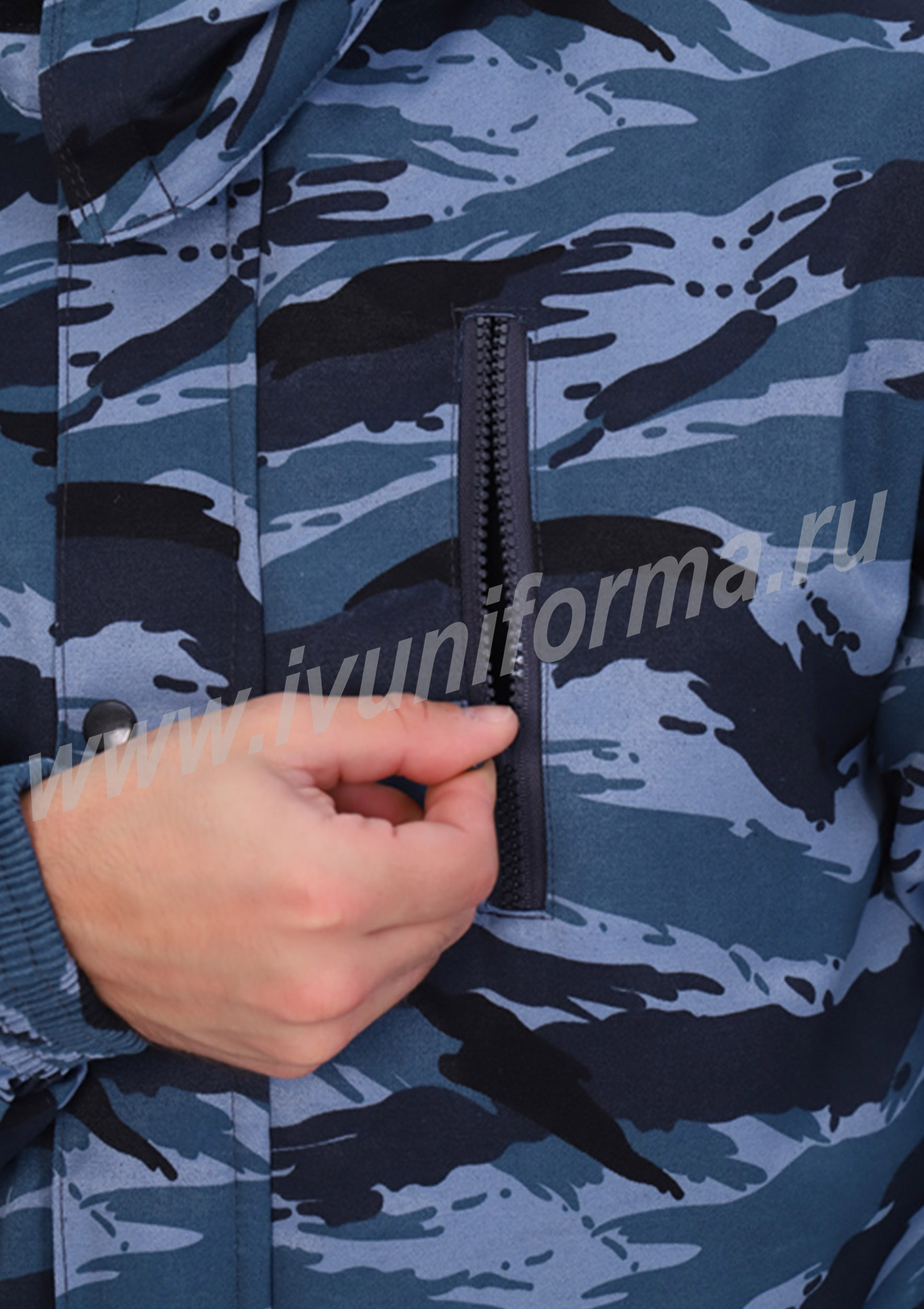 Куртка рабочая мужская для охранника, укороченная, с капюшоном на разъемной молнии, закрытой ветрозащитной планкой на кнопках. На полочке один нагрудный прорезной карман на молнии, нижние карманы прорезные с листочками. Один внутренний карман на молнии. Рукава с притачными манжетами. Воротник - стойка. Капюшон съемный с регулировкой по объему. Куртка предназначена как для повседневной носки на предприятиях так и для сотрудников охранных структур.